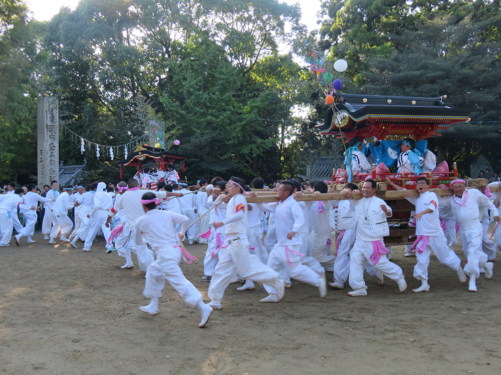 | 内容 | 湯立神事、大祭神事、山車町内巡行、宮入 7時~ 湯立神事 8時30分~ 大祭神事 14時30分~ 山車、子供みこし、宮入 |