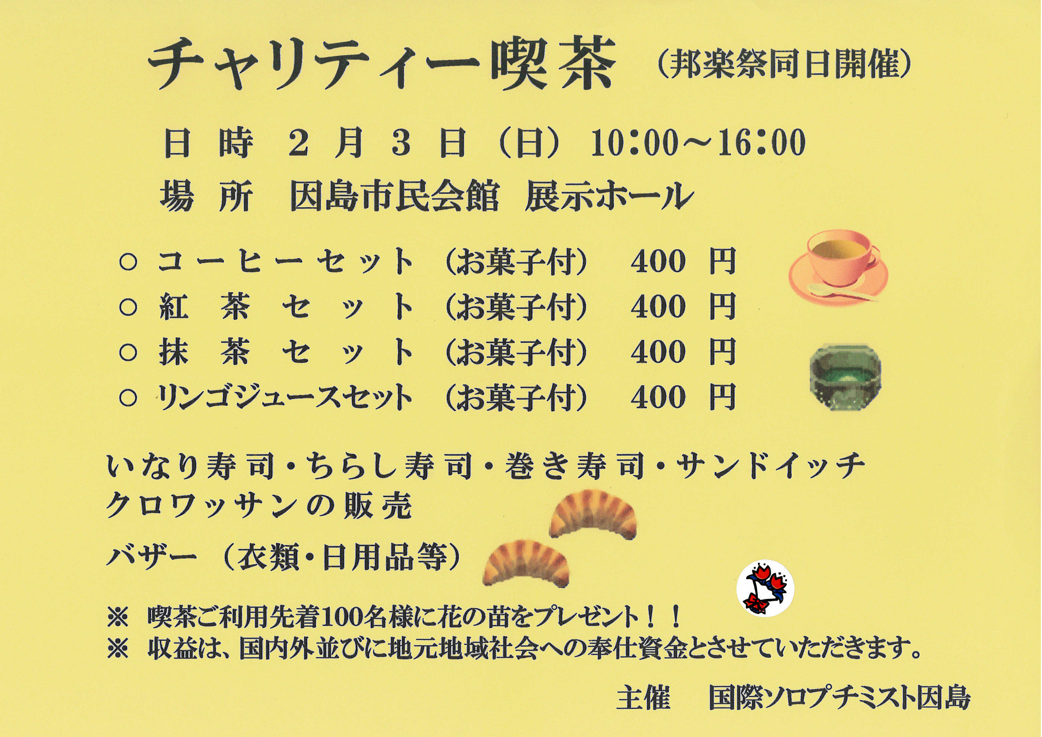 2018年12月20日 / 最終更新日 : 2018年12月20日 因島観光協会 案内 チャリティー喫茶(邦楽祭同日開催) 因島市民会館 展示ホールにて行われます! 日時:2019年2月3日(日) 時間:10時~16時 ※喫茶ご利用先着100名様に花の苗をプレゼント 主催◆国際ソロプチミスト因島