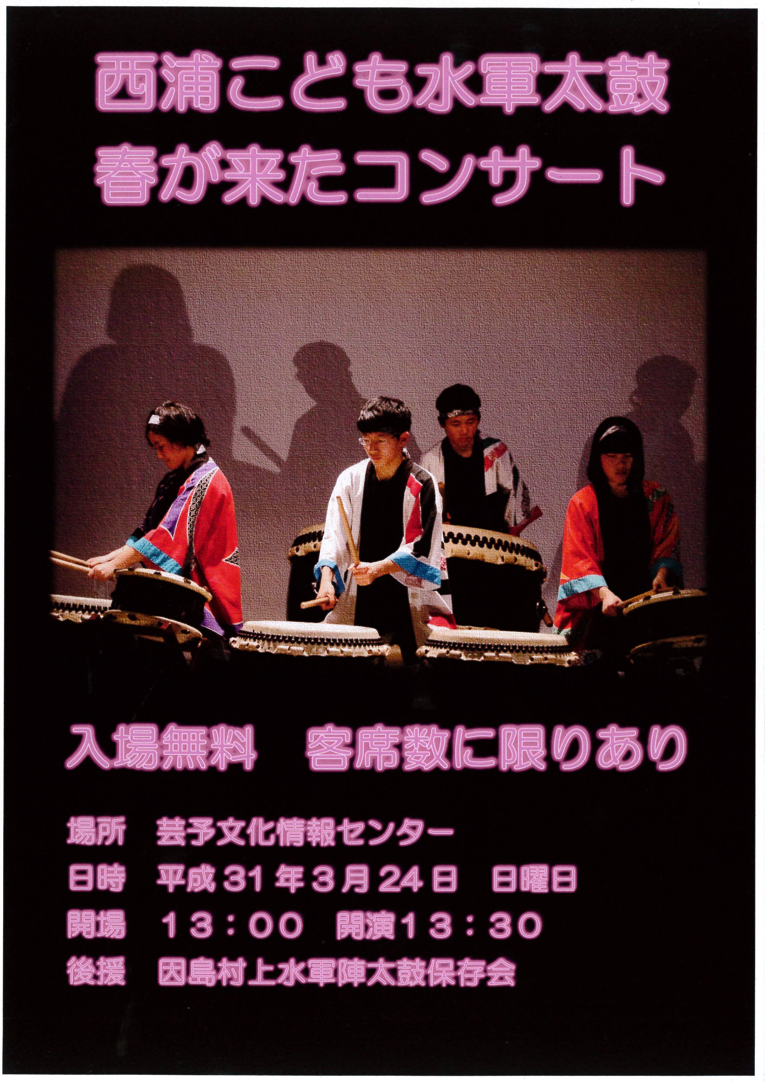 2019年3月20日 / 最終更新日 : 2019年3月20日 因島観光協会 案内 西浦こども水軍太鼓 春が来たコンサート 芸予文化情報センターにて「西浦こども水軍太鼓 春が来たコンサート」が開催されます! 日時 2019年3月24日(日) 場所 芸予文化情報センター 時間 開場 13:00 開演13:30 入場料 無料 ※客席数に限りがありますのでご了承下さい。 後援:因島村上水軍陣太鼓保存会