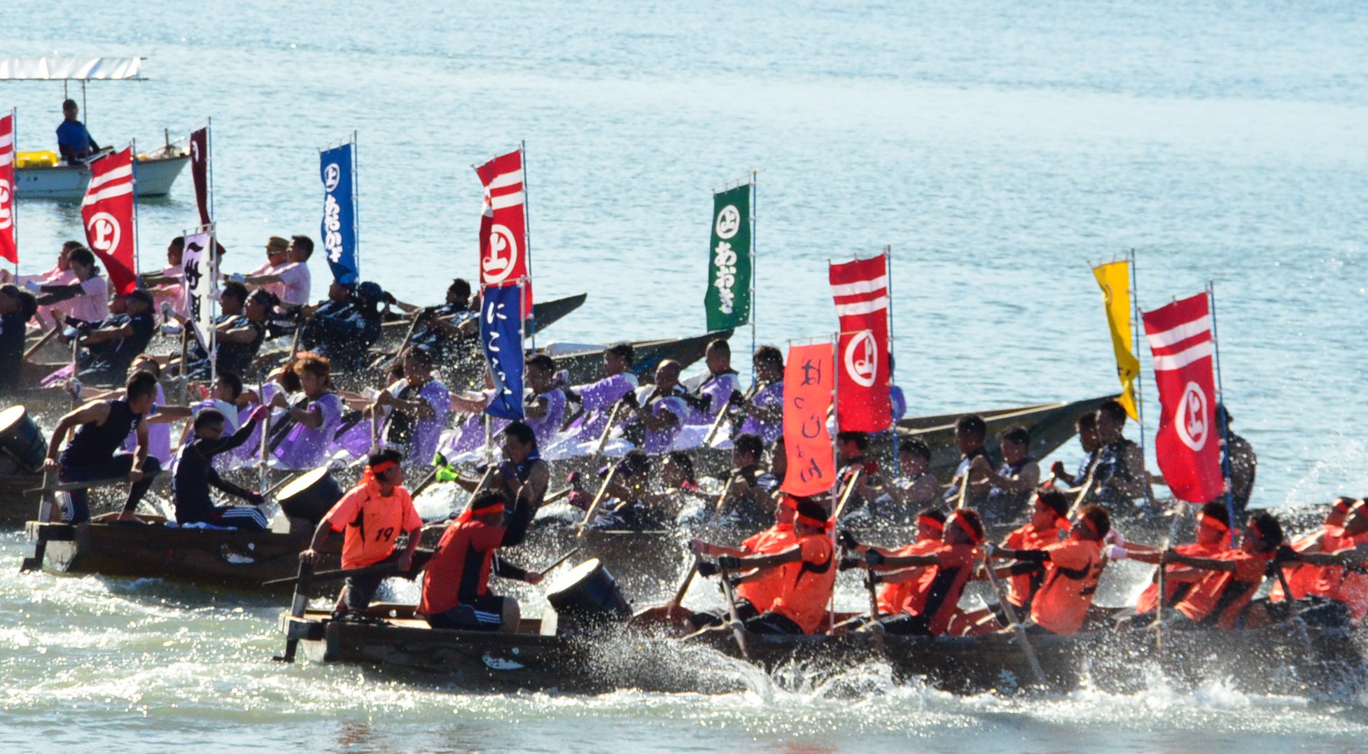 櫂の漕ぎ手14 人と舵取りの船頭、太鼓を打つ人の計16 人が乗り込み、約1km(予定)のコースで競います。