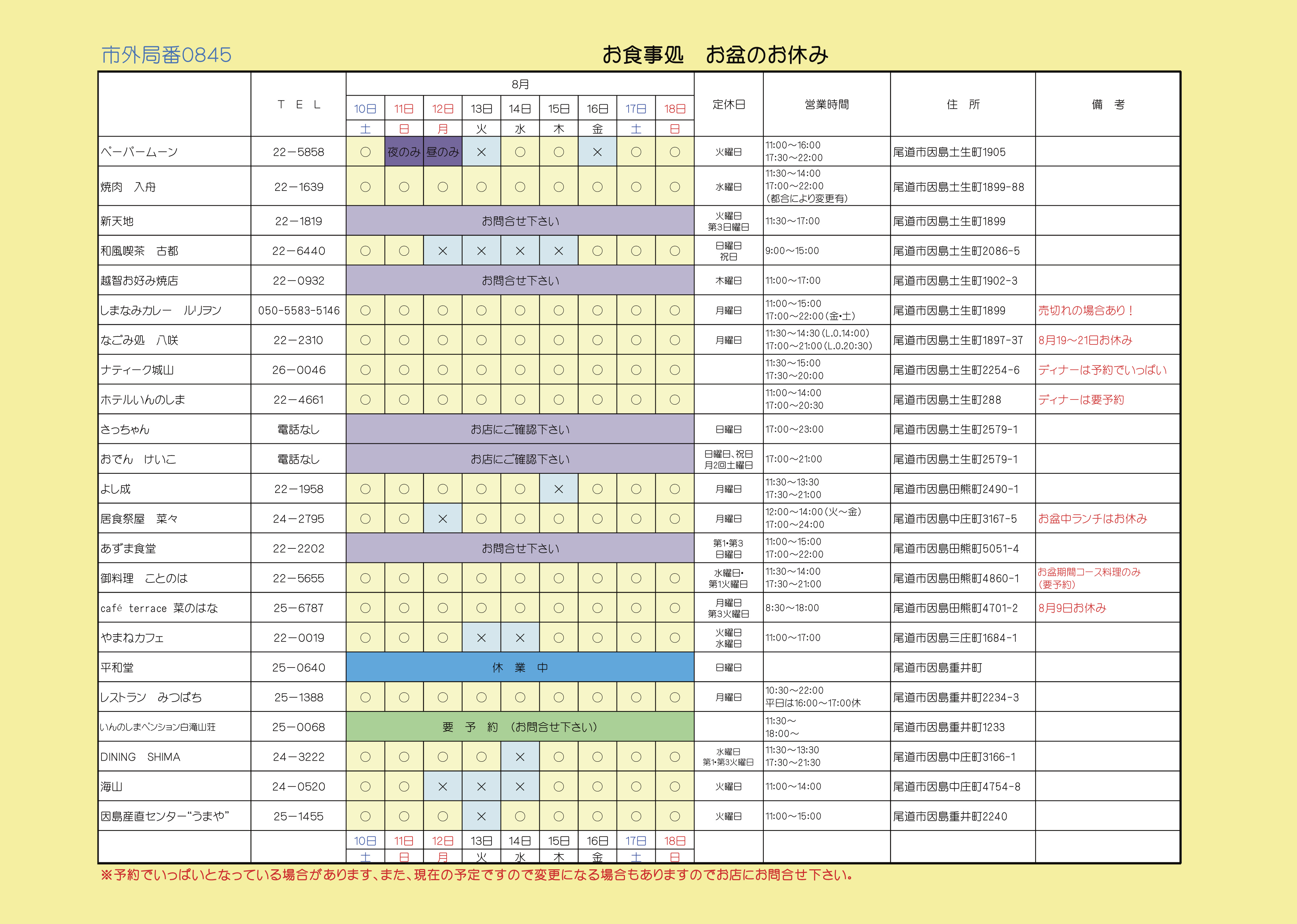 2019年8月10日 / 最終更新日 : 2019年8月11日 因島観光協会 案内 お食事処 お盆のお休み情報 お盆期間お食事処のお休み情報です! お休みが変更になったり、予約でいっぱいの可能性もありますのでご了承下さい。