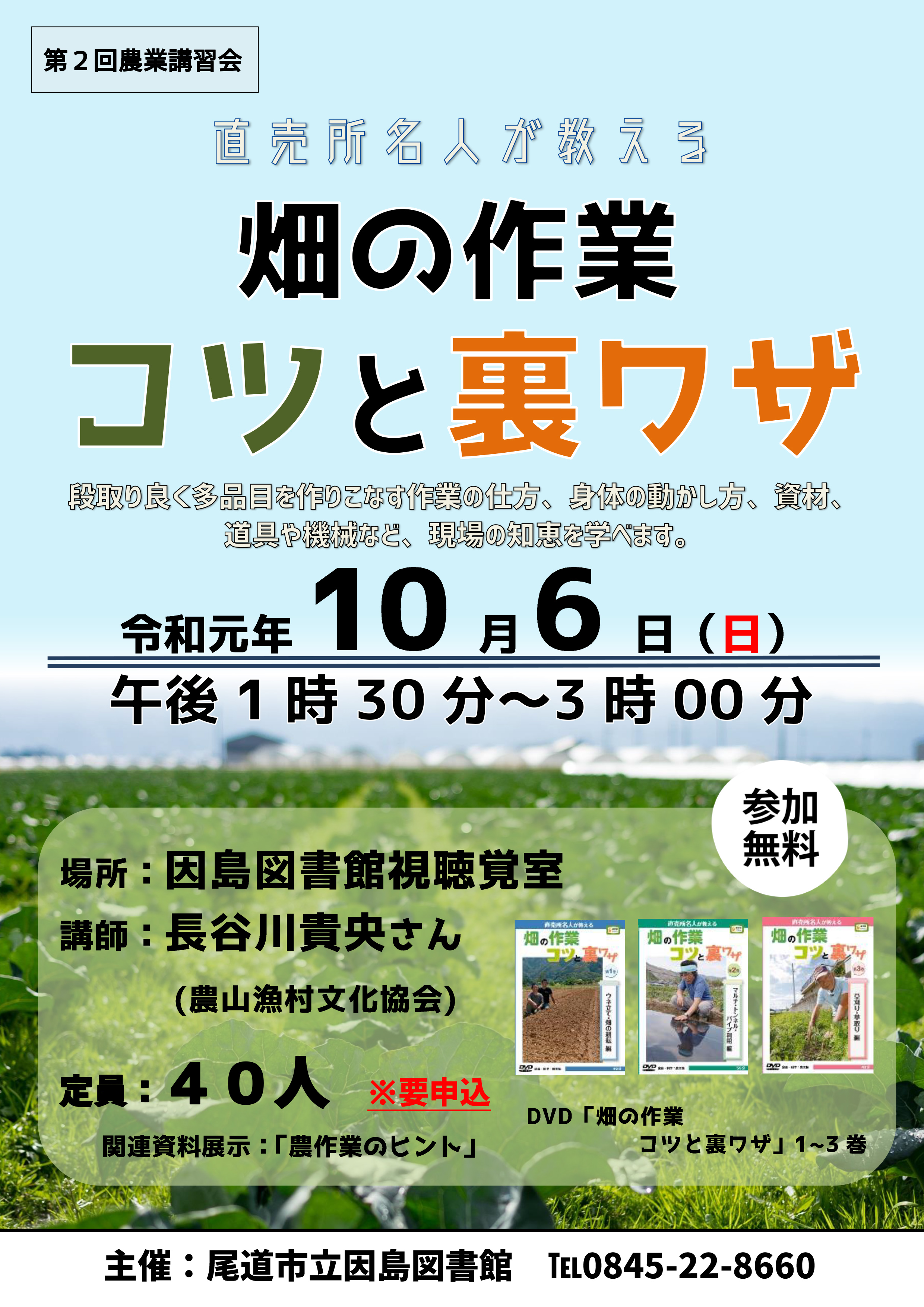 2019年9月17日 / 最終更新日 : 2019年9月17日 因島観光協会 案内 畑の作業コツと裏ワザ 直売所名人が教える 畑の作業コツと裏ワザ 段取り良く多品目を作りこなす作業の仕方、身体の動かし方、資材、道具や機会など、現場の知恵を学べます。 日 時 2019年10月6日(日) 13時30分~15時 場 所 因島図書館視聴覚室 講 師 長谷川 貴央 氏 定 員 40人 ※要申込 お問合せ・お申込み先 尾道市立因島図書館 TEL 0845-22-8660