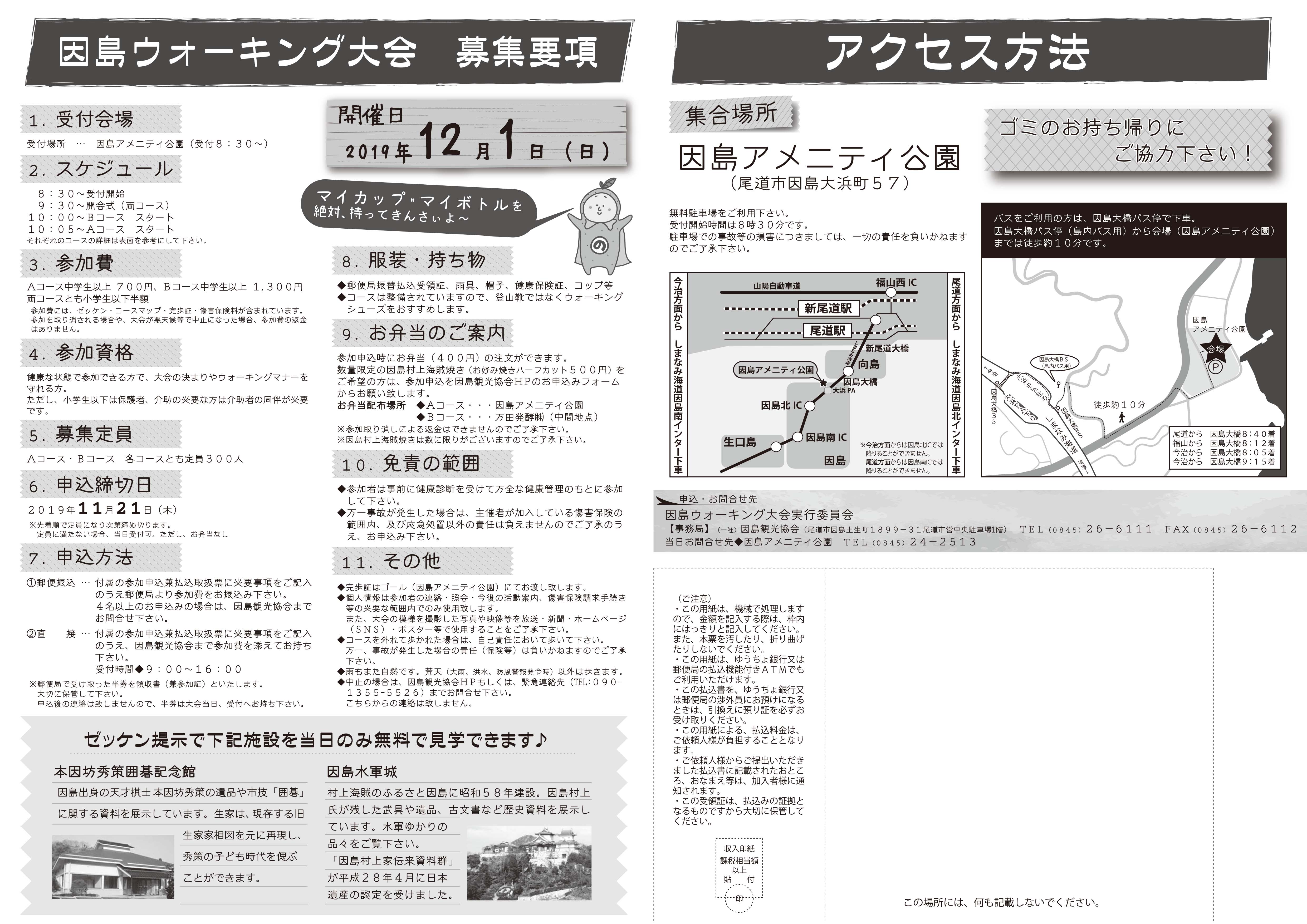 | 料 金 | Aコース5km 大人700円(小学生以下半額) Bコース18km 大人1,300円(小学生以下半額) お弁当 400円 因島村上海賊焼き(お好み焼きハーフカット)500円 ※限定200枚 |