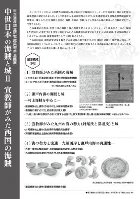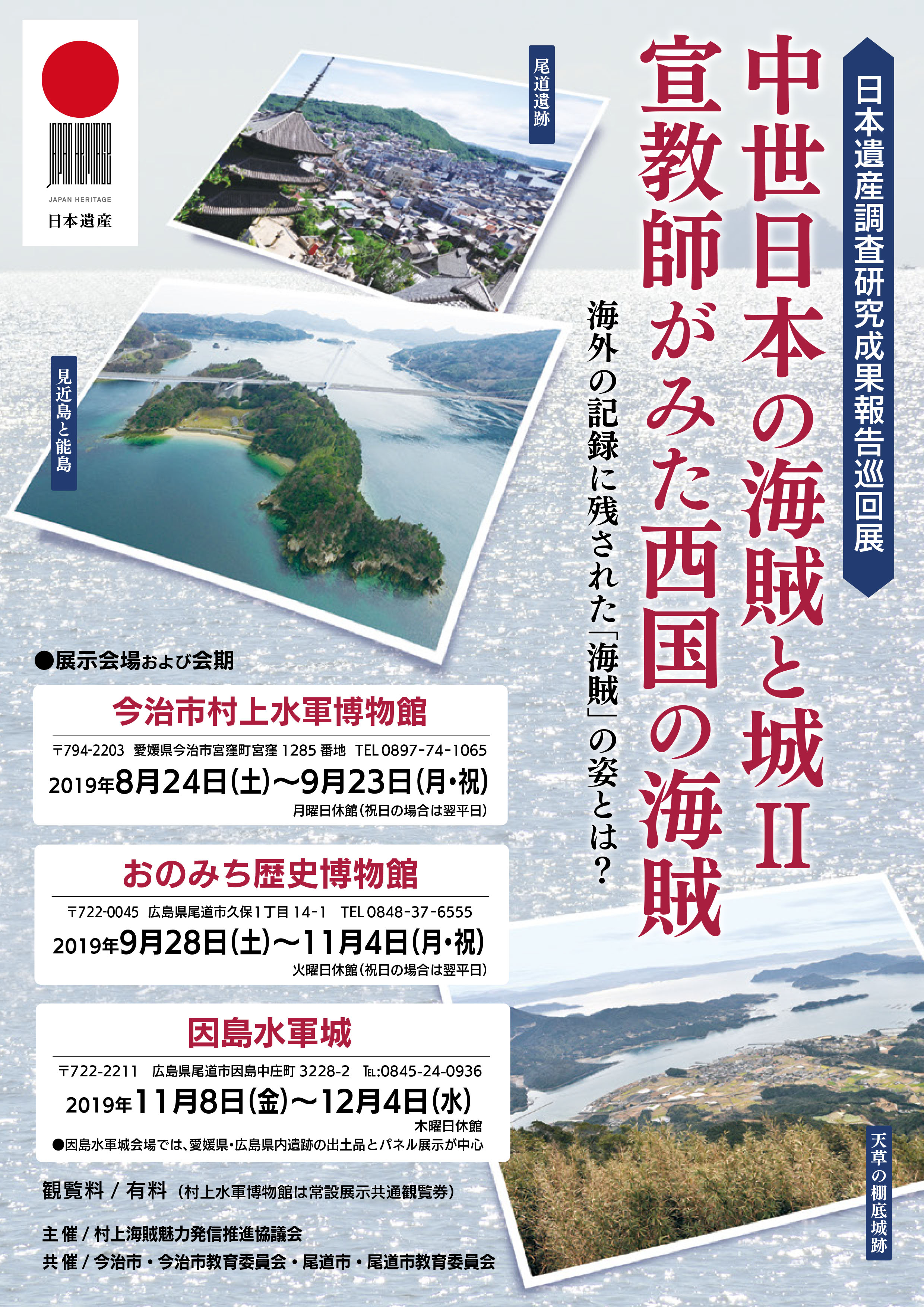 2019年10月17日 / 最終更新日 : 2019年10月28日 因島観光協会 イベント 因島水軍城 巡回展 中世日本の海賊と城Ⅱ 宣教師がみた西国の海賊 展示会場及び会期 今治市村上水軍博物館 2019年8月24日(土)~9月23日(月・祝) おのみち歴史博物館 2019年9月28日(土)~11月4日(月・祝) 因島水軍城 2019年11月8日(金)~12月4日(水) ※因島水軍城では、愛媛県・広島県内遺跡の出土品とパネル展示が中心