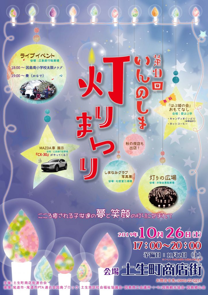 2019年10月19日 / 最終更新日 : 2019年10月28日 因島観光協会 案内 いんのしま灯りまつり 土生町商店街にて「いんのしま灯りまつり」が開催されます! ライブイベントや写真展、秋の夜店などが行われます。 灯りに包まれた土生町商店街に是非お越しください♪ 日 時 2019年10月26日(土) 予備日:11月2日(土) 場 所 土生町商店街 【お問合せ先】 土生町商店街 TEL 0845-22-0216(吉徳屋)