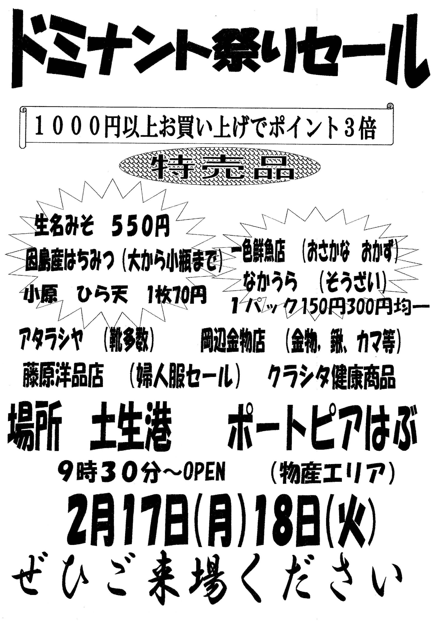 2020年2月7日 / 最終更新日 : 2020年2月7日 因島観光協会 案内 ドミナント祭りセール ドミナント祭りセールがポートピアはぶにて開催されます! 日 時 2020年2月17日(月)・18日(火) 場 所 ポートピアはぶ 物産エリア(尾道市営中央駐車場) 時 間 OPEN 9時30分~