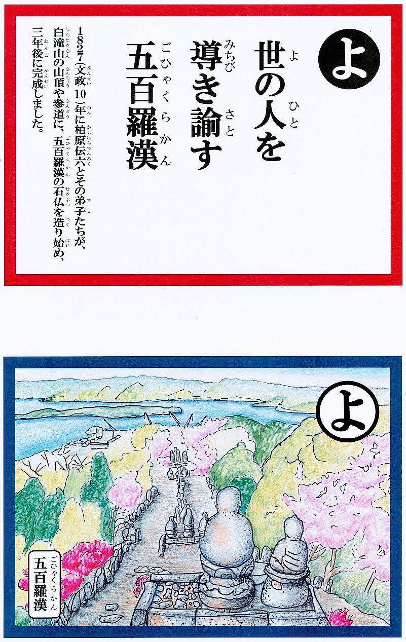 地域の方と一緒に、「あ」から「ん」までの46項目のテーマを決め、詠み札をつくり、説明文を完成させ、絵札は、実際に現地に行って実物を見てイメージを膨らませたそうです。