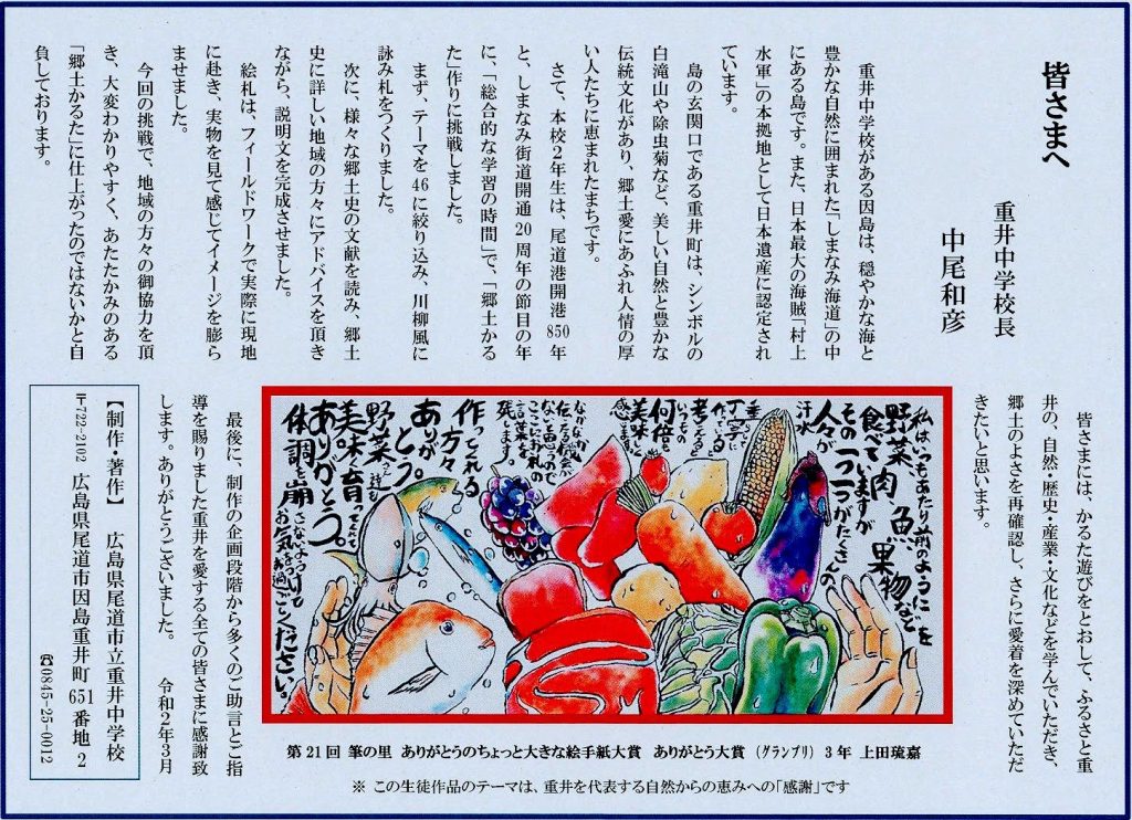 令和元年度、重井中学校2年生は、「総合的な学習の時間」で郷土のかるたづくりに挑戦しました。
