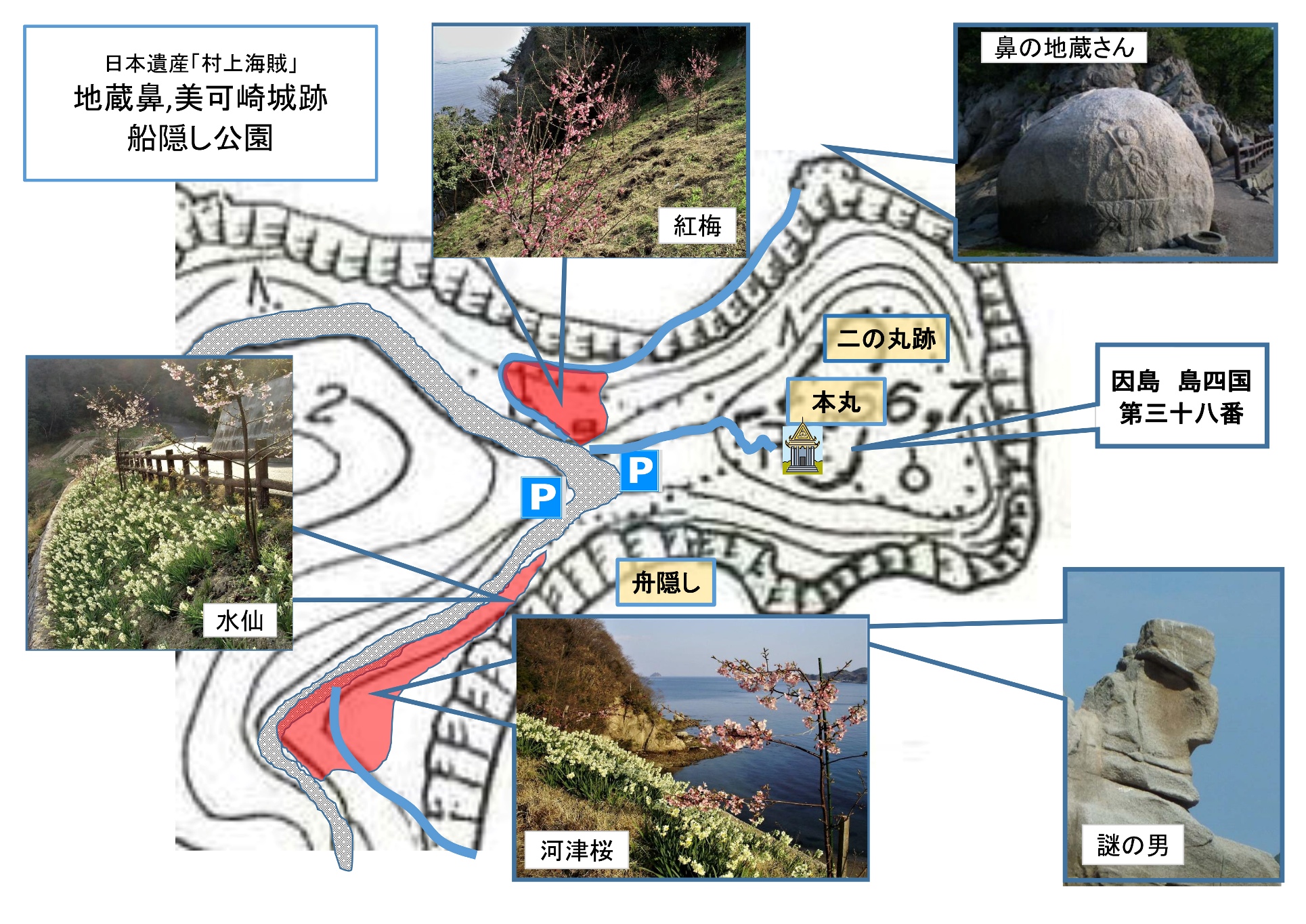 2020年2月14日 / 最終更新日 : 2020年4月5日 因島観光協会 案内 河津桜 2月中旬~下旬ころが見頃の河津桜。(自然ですので見頃は前後します。ご了承下さい。) 三庄町の美可崎城跡周辺でご覧いただけます。 水仙も植えられていますので、水仙と河津桜と共に景色を楽しみませんか。