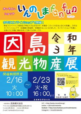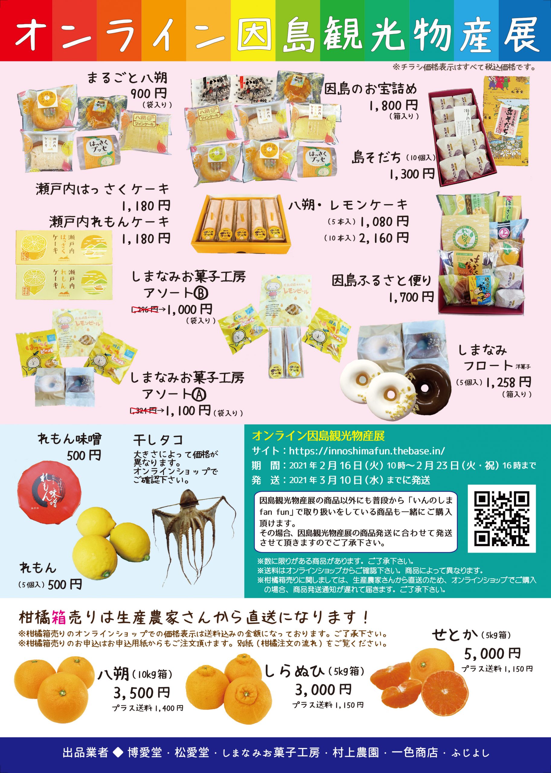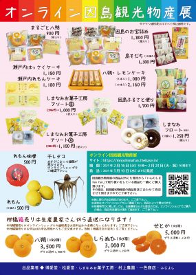 毎年、東京銀座の“ひろしまブランドショップTAU”にて開催している「因島観光物産展」ですが、新型コロナウイルス感染の再拡大する状況の中、来場者・スタッフの安全と安心を考慮し、オンラインショップで開催することとなりました。