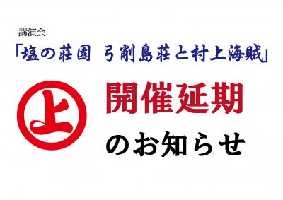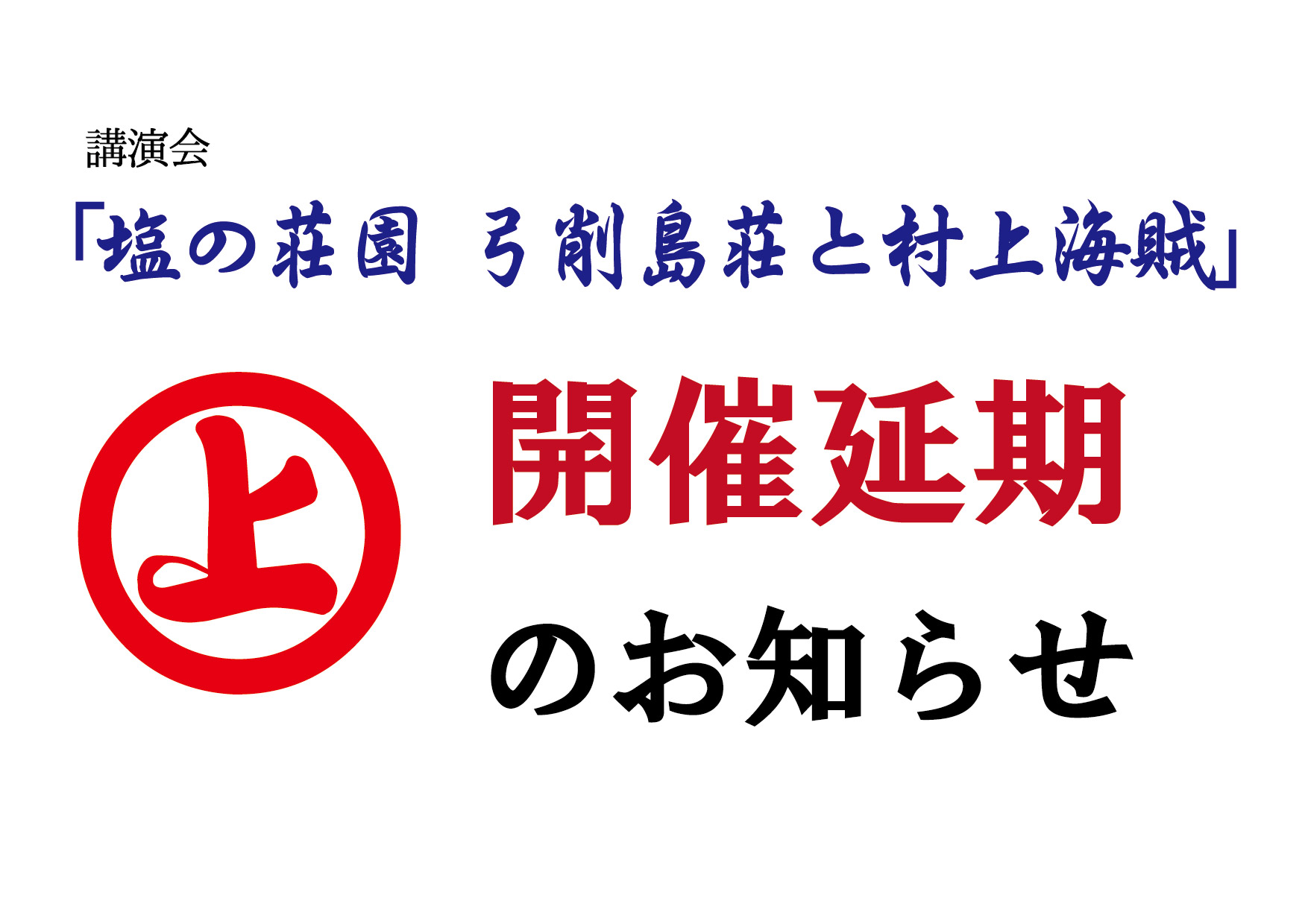 2021年8月6日 / 最終更新日 : 2021年8月6日 因島観光協会 案内 講演会「塩の荘園 弓削島荘と村上海賊」【延期】のお知らせ 広島県の早期集中対策の重点区域に尾道市が追加された事を受け、2021年8月22日(日)に開催を予定していました「塩の荘園 弓削島荘と村上海賊」の講演会開催を延期させていただく事となりました。 開催日時については現在未定です。 決まり次第HPに掲載致します。 ご理解のほどよろしくお願い致します。 集中対策期間◆2021年9月12日(日) 【お問合せ先】 (一社)因島観光協会 TEL 0845-26-6111