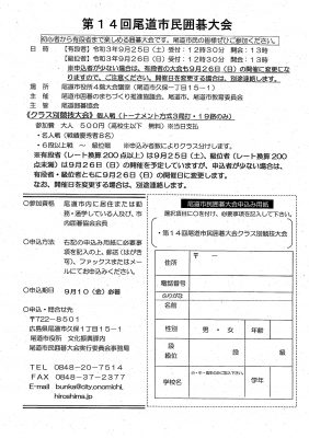 2021年8月11日 / 最終更新日 : 2021年8月11日 因島観光協会 案内 第14回尾道市民囲碁大会 初心者から有段者まで楽しめる囲碁大会です。 参加資格◆尾道市内に居住または勤務・通学している人及び、市内囲碁協会会員 【お申込・お問合せ先】 尾道市役所 文化振興課内 尾道市民囲碁大会実行委員会事務局 TEL 0848-20-7514 FAX 0848-37-2377