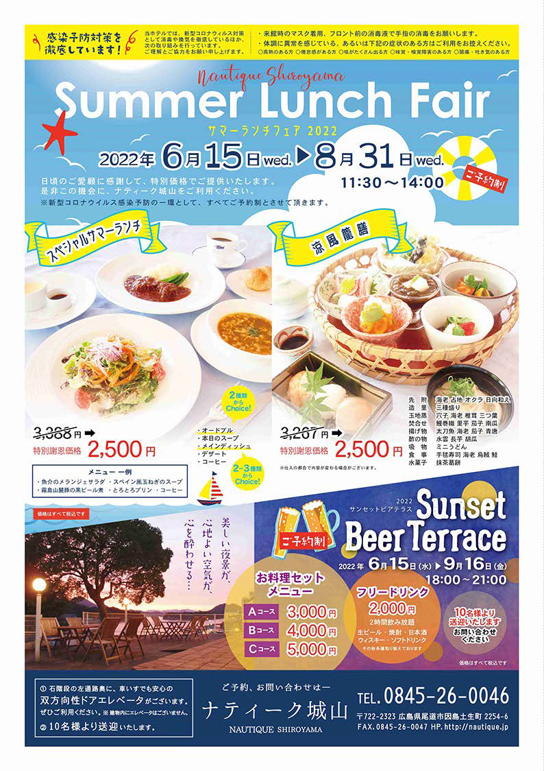 2022年6月15日 / 最終更新日 : 2022年6月15日 因島観光協会 PR Summer Lunch Fair ナティーク城山さんの「Summer Lunch Fair」のご案内です! 期間◆2022年6月15日(水)~2022年8月31日(水)まで 時間◆11:30~14:00 ※ご予約制となっております! https://nautique.jp/news/index.html#news064