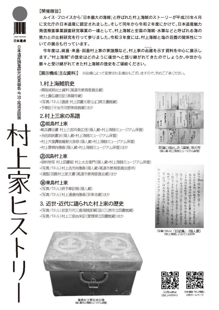 2022年7月11日 / 最終更新日 : 2022年7月12日 因島観光協会 案内 巡回展「村上家ヒストリー」 日本遺産村上海賊尾道今治巡回展 「村上家ヒストリー」語り継がれてきた村上家の歴史 が因島水軍城にて開催されます! 期間◆2022年10月28日(金)~11月30日(水) 巡回場所 ●今治市村上海賊ミュージアム 期間:2022年6月18~8月28日 ●おのみち歴史博物館 期間:2022年9月23日~10月23日 ●因島水軍城 期間:2022年10月28日~11月30日