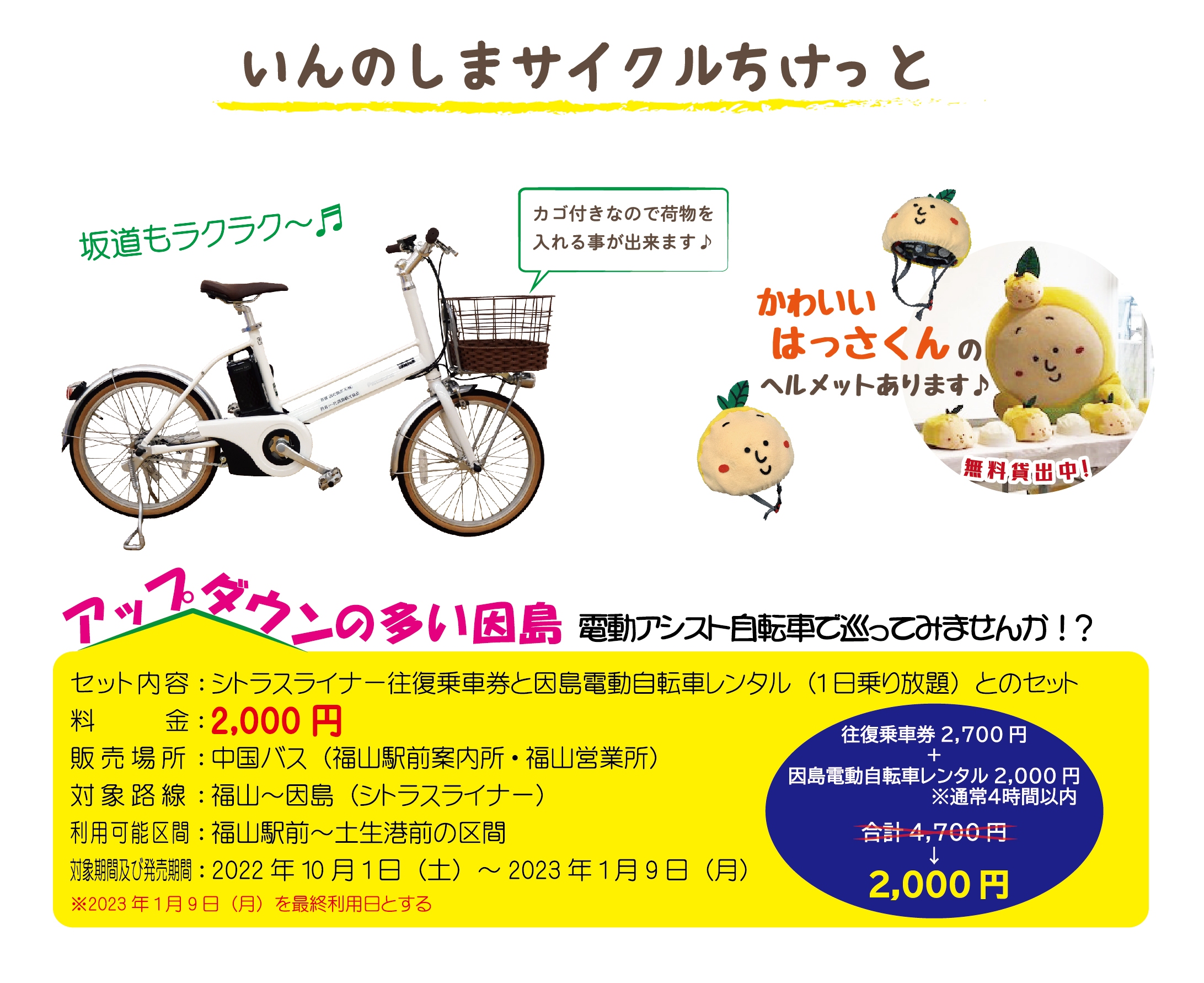 因島電動アシスト自転車のお得なレンタル券がセットされています。