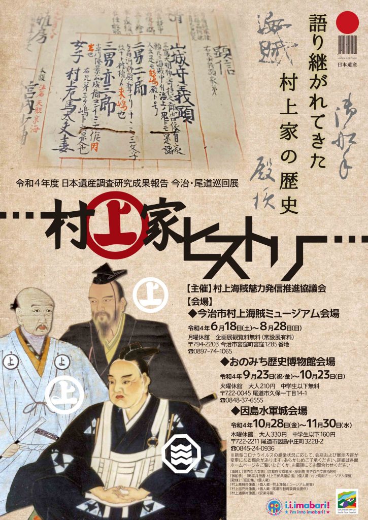 2022年10月27日 / 最終更新日 : 2022年11月9日 因島観光協会 イベント 巡回展「村上家ヒストリー」 開催中 令和4年度日本遺産調査研究成果報告今治・尾道巡回展 「村上家ヒストリー」 が、因島水軍城にて開催されます! 期間◆2022年10月28日(金)~2022年11月30日(水) 因島水軍城 〒722-2211広島県尾道市因島中庄町3228-2 TEL 0845-24-0936 休館日:毎週木曜日(祝日除く)
