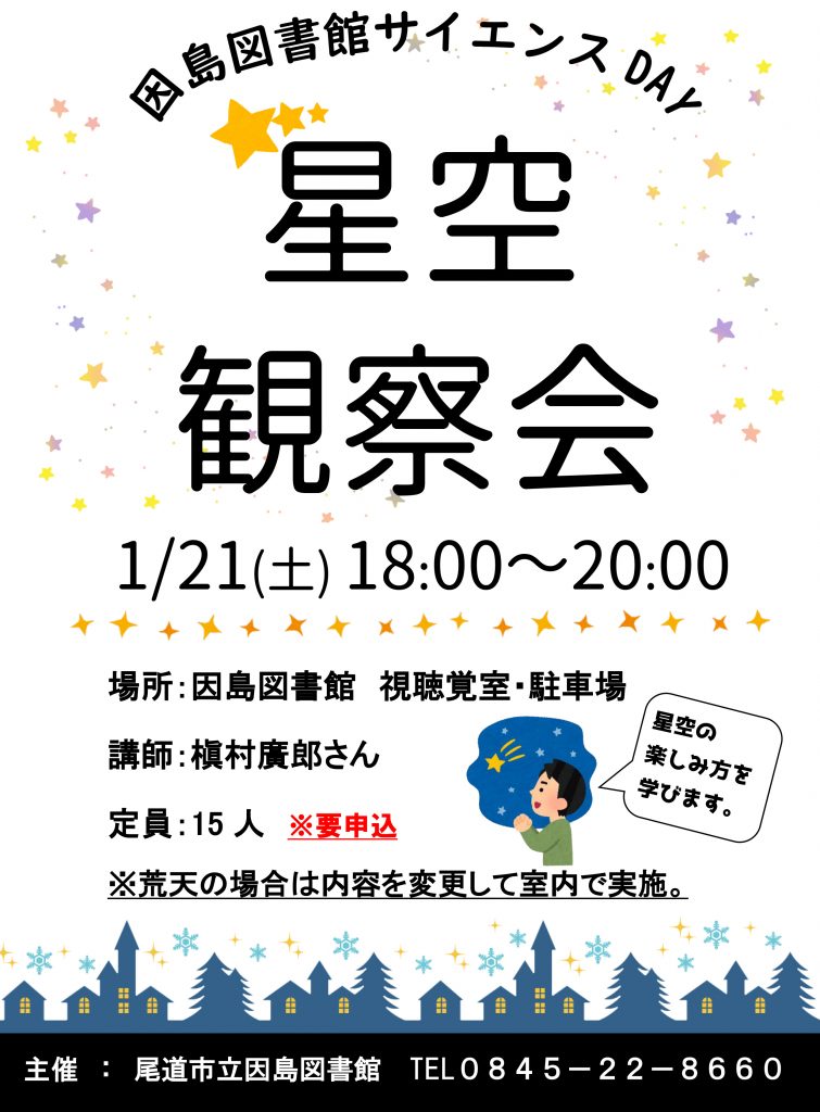 2023年1月12日 / 最終更新日 : 2023年1月16日 因島観光協会 PR 【定員に達しました】因島図書館サイエンスDAY「星空観察会」 因島図書館にて「星空観察会」が開催されます! 日にち 2023年1月21日(土)18:00~20:00 場 所 因島図書館 視聴覚室・駐車場 講 師 槇村廣郎さん 定 員 15人 ※要申込 (定員に達したため受付終了) お申込先 尾道市立因島図書館 TEL 0845-22-8660
