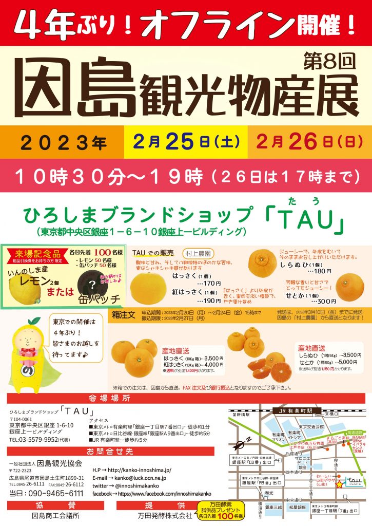 4年ぶりに開催!東京銀座の「ひろしまブランドショップTAU」にて『因島観光物産展』!
