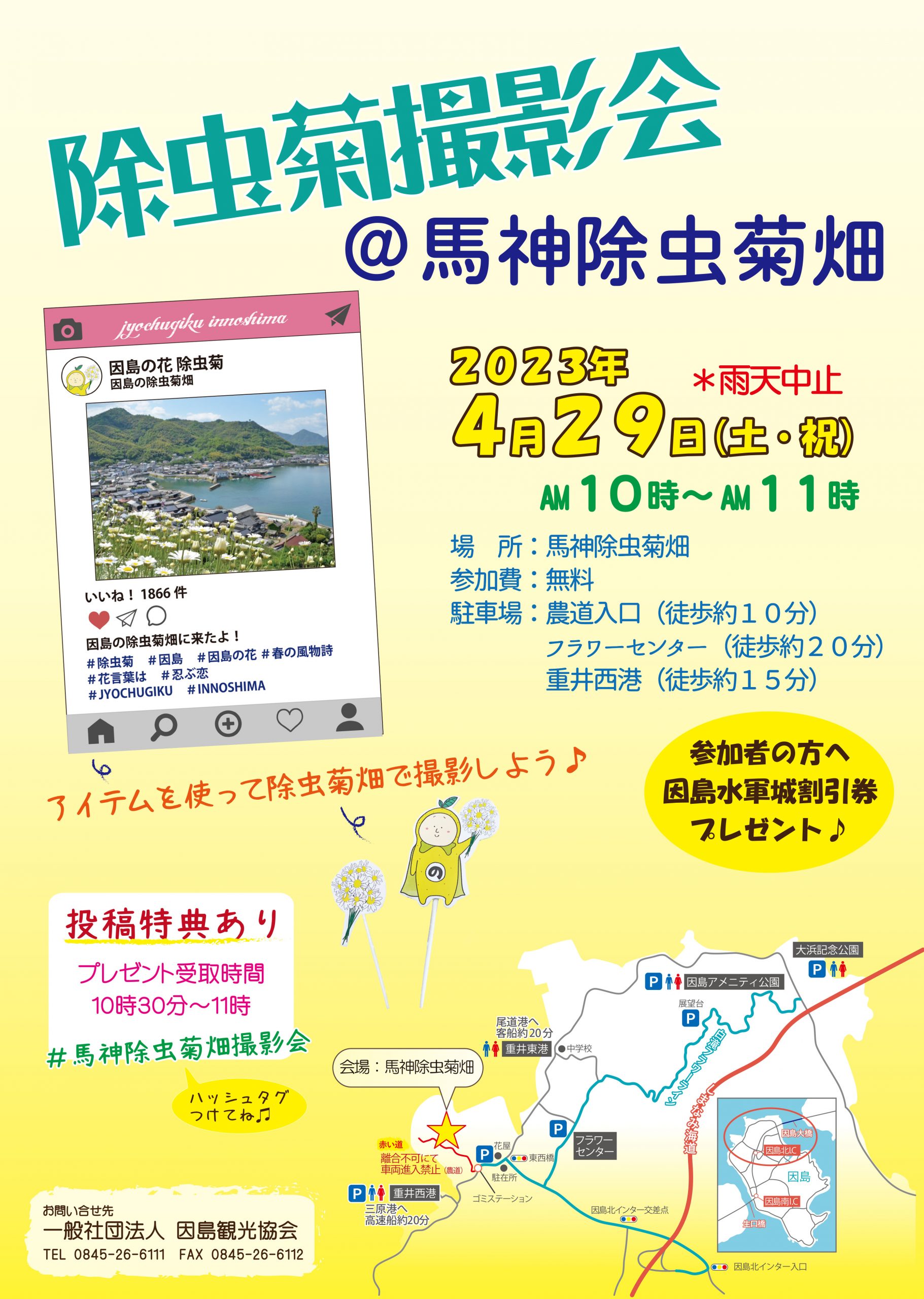 | 投稿特典 | ハッシュタグ「#馬神除虫菊畑撮影会」をつけて投稿 下記商品を抽選でプレゼント♪ ☆因島の除虫菊を使った線香手作りキット&除虫菊クリアファイル・・・5名 ☆はっさくんメッセージマスキングテープ・・・20名 ☆はっさくんマスキングテープPart.1・・・20名 プレゼント受取時間:10時30分~11時 ※但し、プレゼント商品なくなり次第終了 |