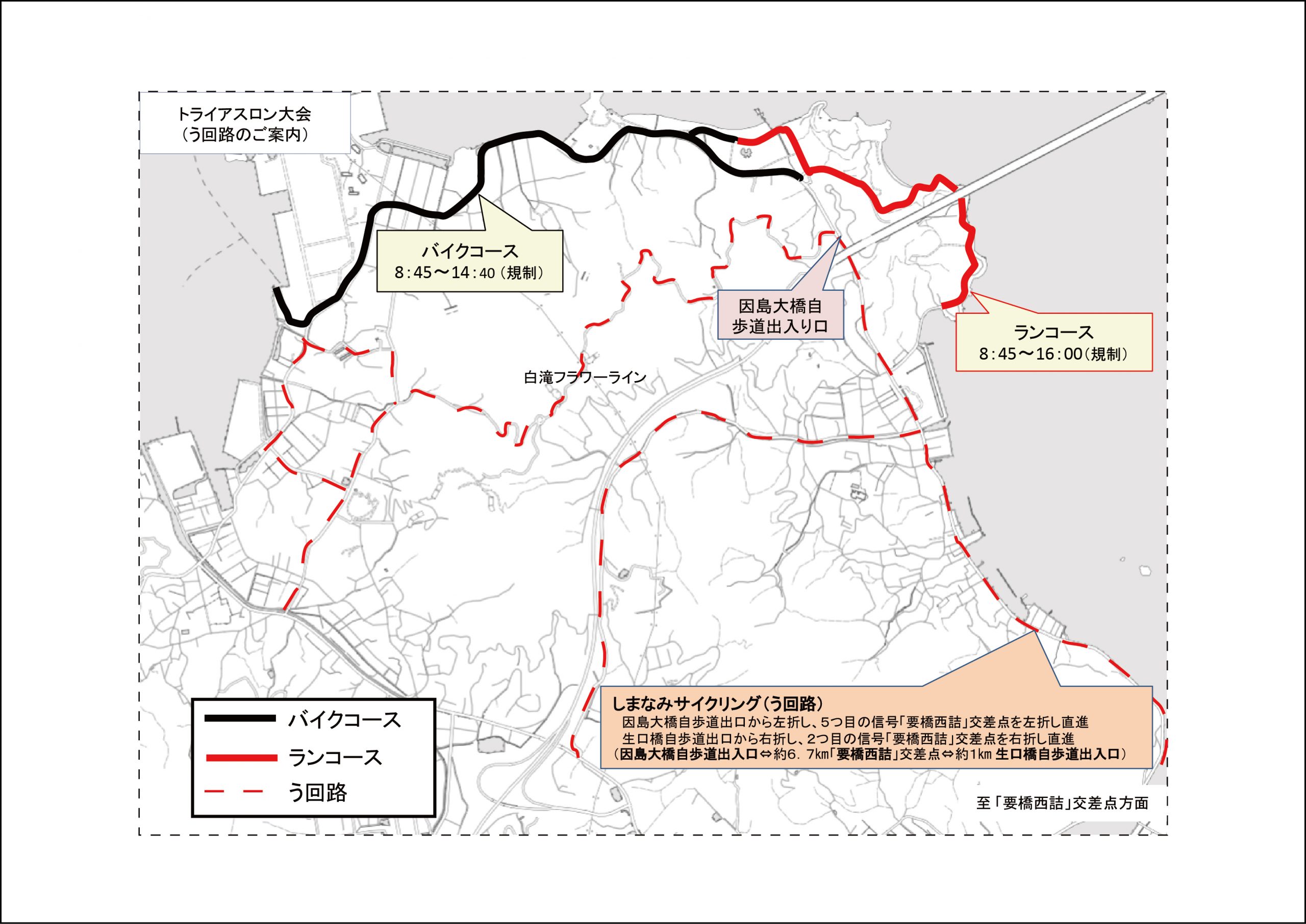 「2023西日本学生トライアスロン選手権尾道因島大会」の開催に伴い、因島アメニティ公園周辺から重井東港の間の道路が通行止めになります。