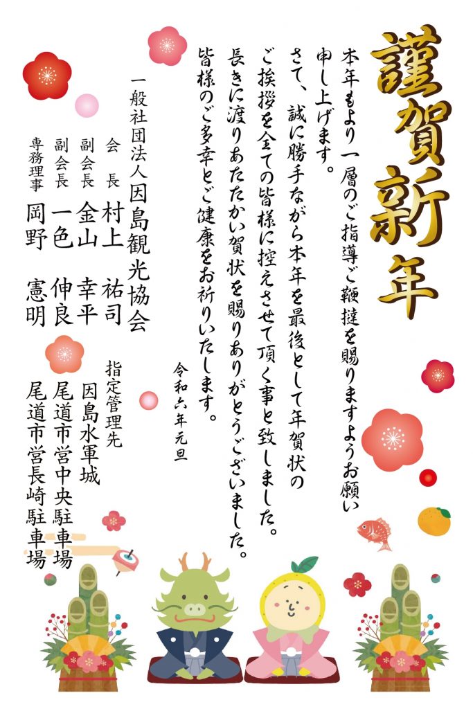 2024年1月1日 / 最終更新日 : 2024年1月17日 因島観光協会 案内 2024謹賀新年 あけましておめでとうございます。 本年もよろしくお願い致します。 因島観光協会は2024年1月3日までお休みです。
