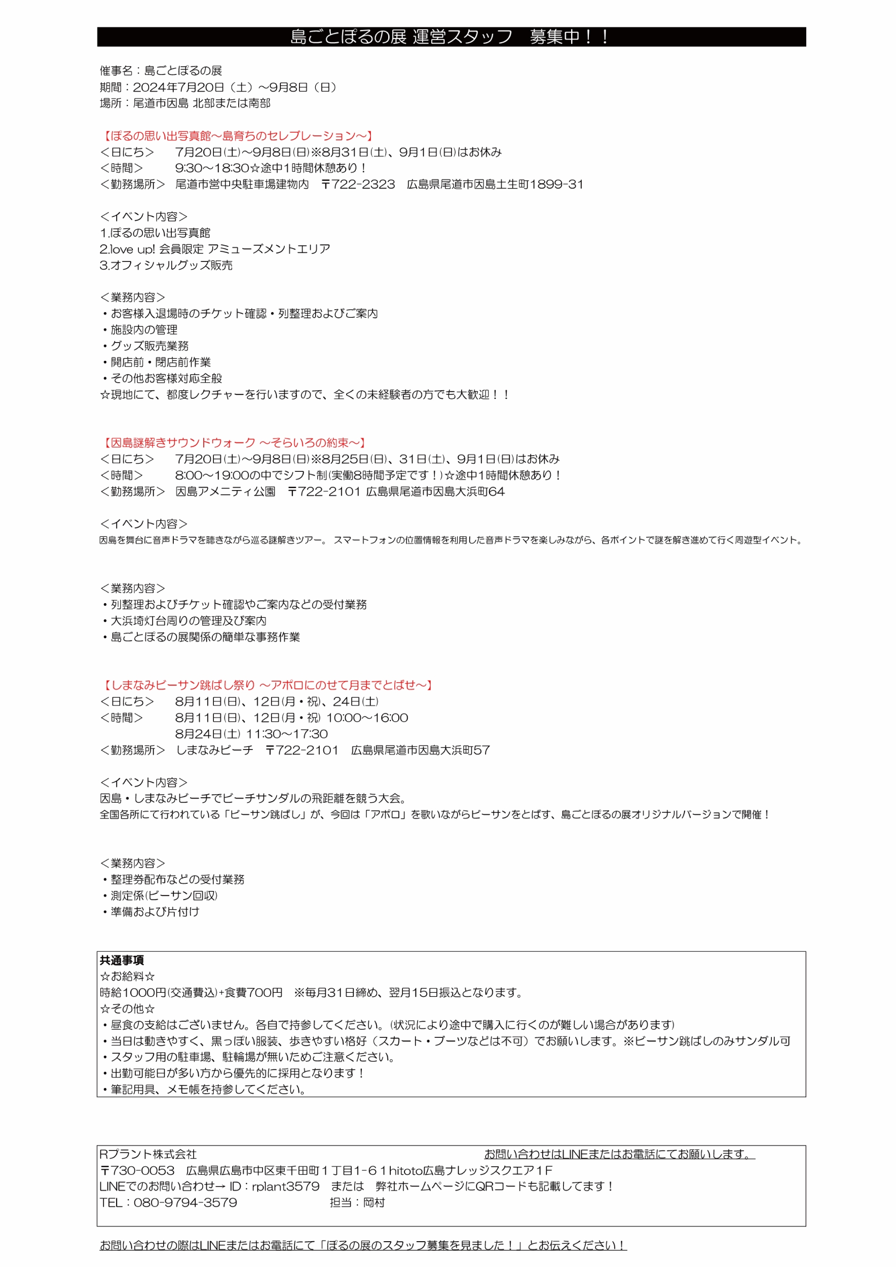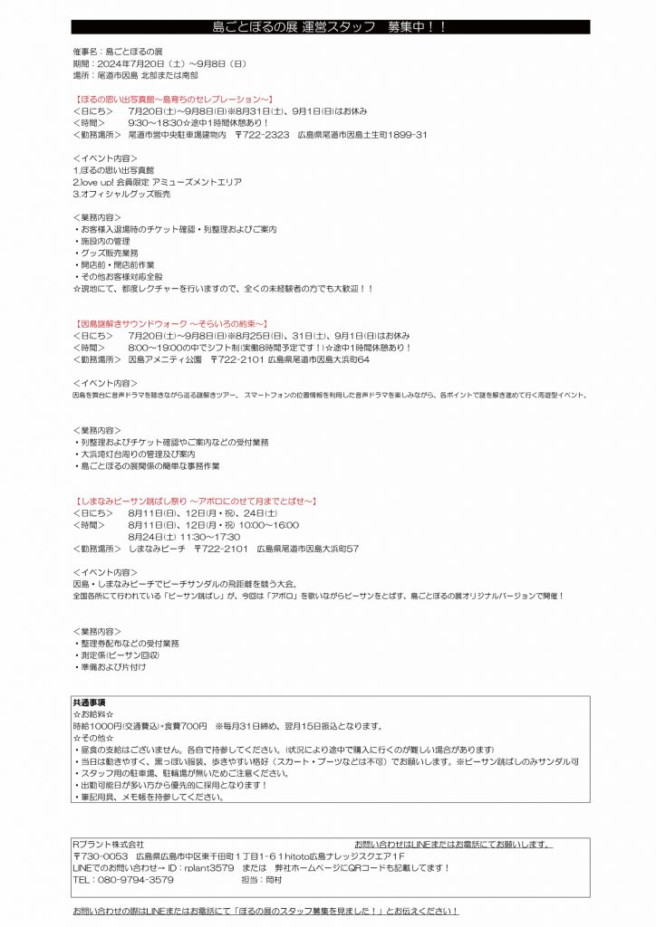 2024年6月26日 / 最終更新日 : 2024年6月26日 因島観光協会 案内 島ごとぽるの展 運営スタッフ 募集中! 「島ごとぽるの展」 運営スタッフ 募集中!! 詳細は下記をご覧ください。↓↓↓ お問い合わせは「Rプラント株式会社」さんへよろしくお願いいたします。