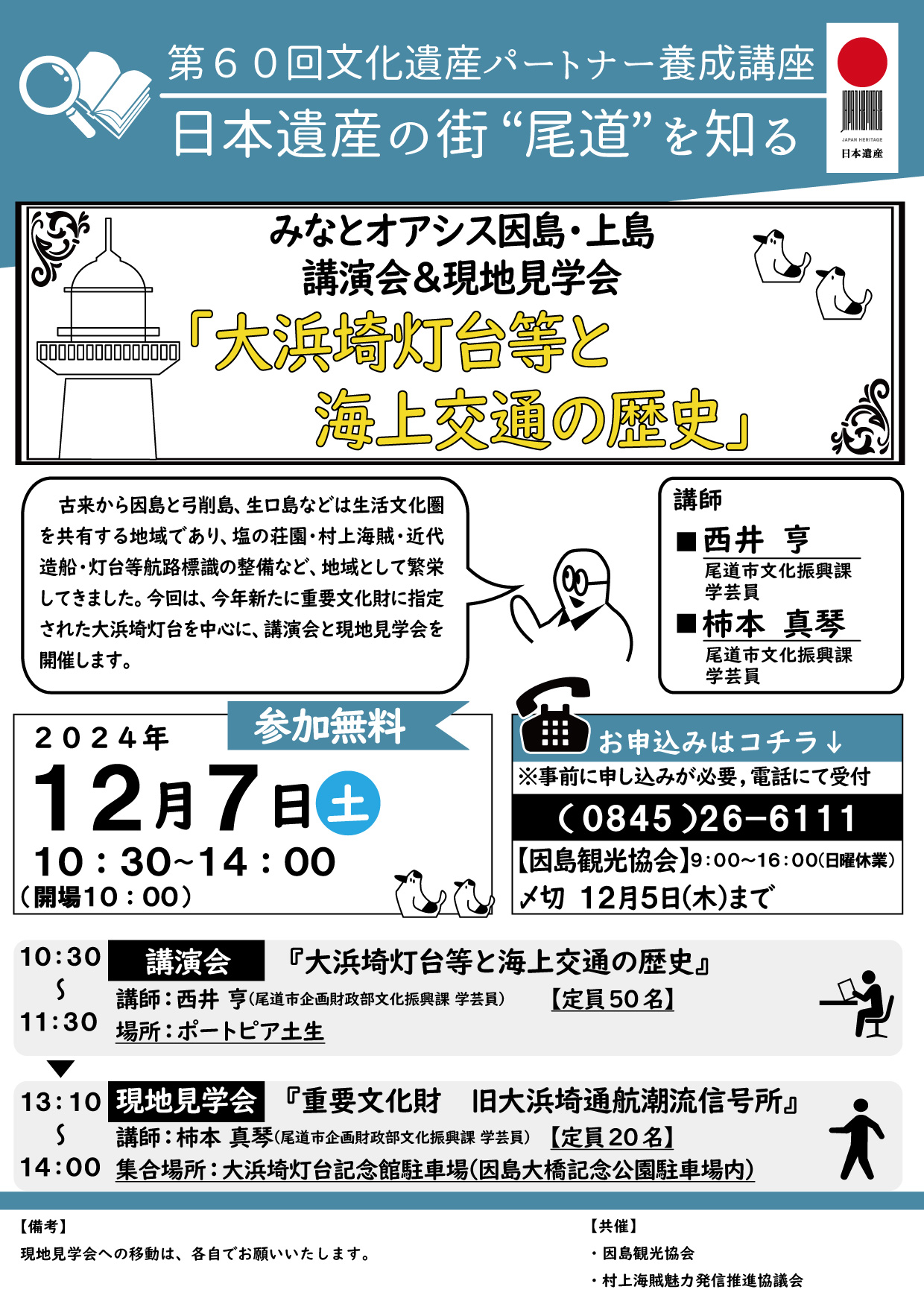 2024年11月25日 / 最終更新日 : 2024年11月25日 因島観光協会 イベント みなとオアシス因島・上島「大浜埼灯台」 みなとオアシス因島・上島で展示・講演会・見学会を開催致します! 詳細は下記チラシをご覧ください。 【お申込み・お問合せ先】 (一社)因島観光協会 TEL0845-26-6111 窓口営業時間:9時~16時 ※当面日曜日or連休最終日休業