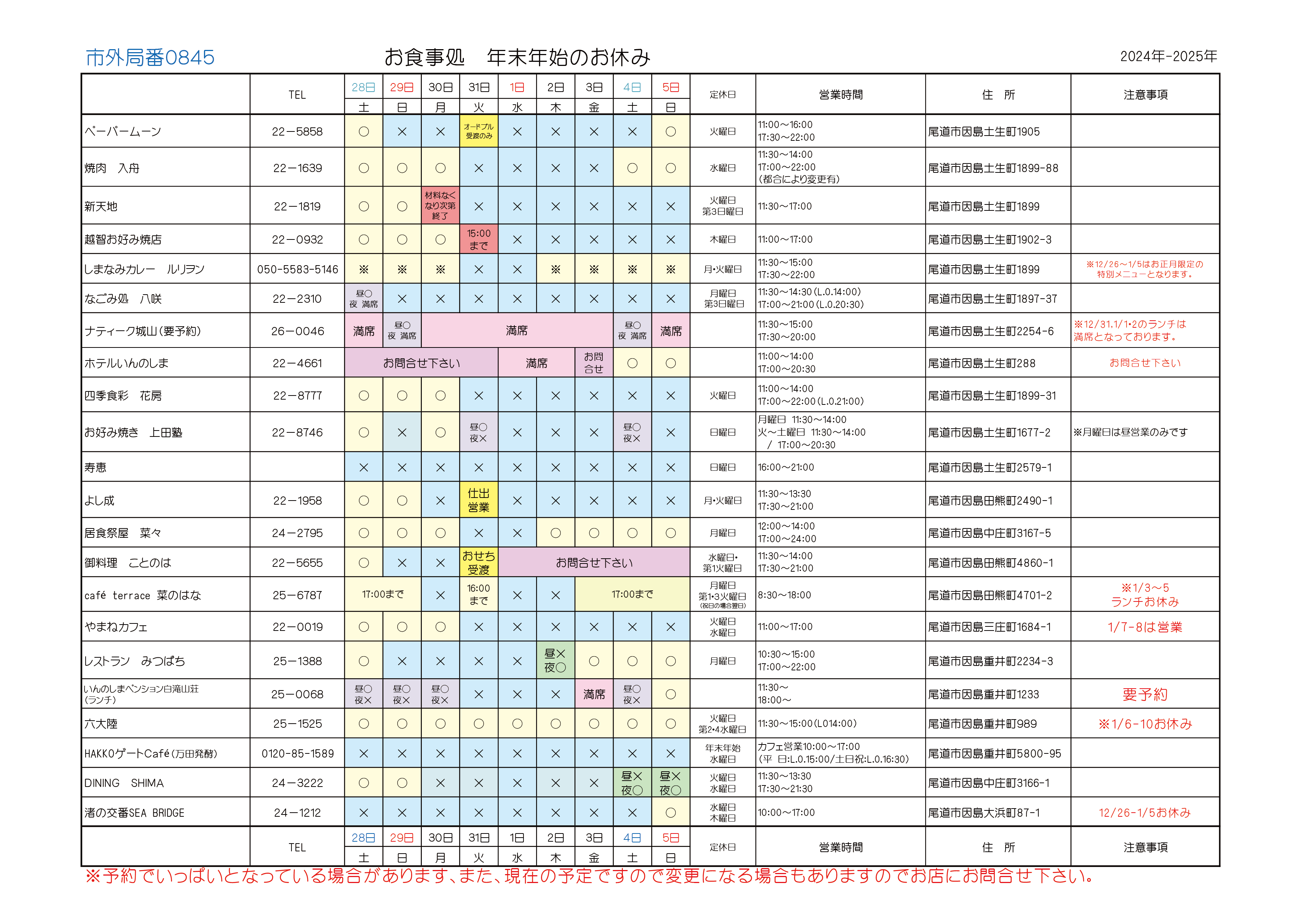 ・因島島内線:12/31までカレンダー通り、1/1~1/3日祝運行、1/4からカレンダー通り (因の島バス)