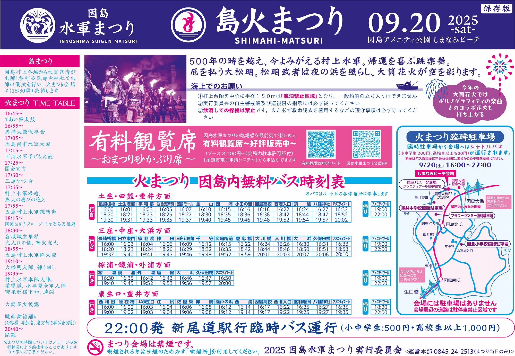 内容:村上水軍本陣入陣・跳楽舞・大松明練り回し、因島村上水軍陣太鼓披露・大筒花火披露 等