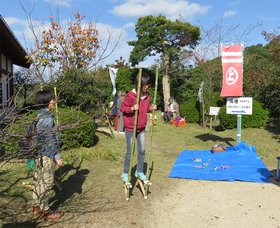 水軍城の地元、中庄の区長会様のお手伝いや、自然を愛する中庄の会の皆様のご協力のもとに竹馬・竹とんぼ体験も、途中で材料の追加をしていただくほど、たくさんのお客様に体験していただきました。