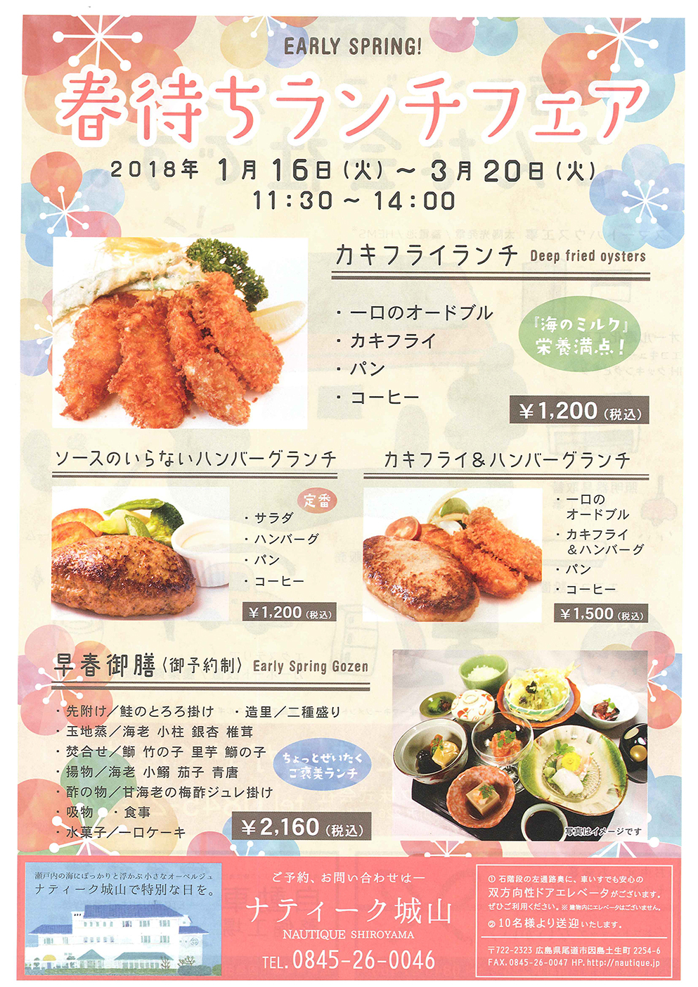 定番のハンバーグランチから、カキフライランチ・カキフライ&ハンバーグランチ・早春御膳(御予約制)を御用意しております。