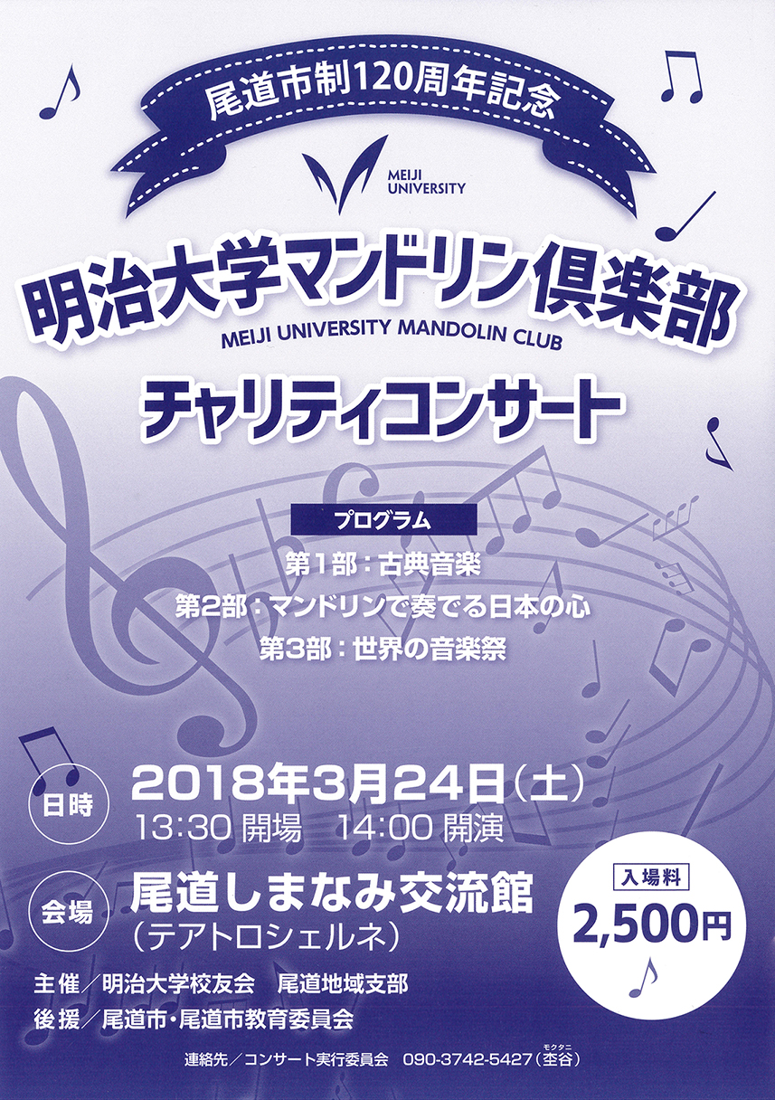 2018年3月24日(土)尾道しまなみ交流館にて、明治大学マンドリン倶楽部によるチャリティーコンサートが行われます。