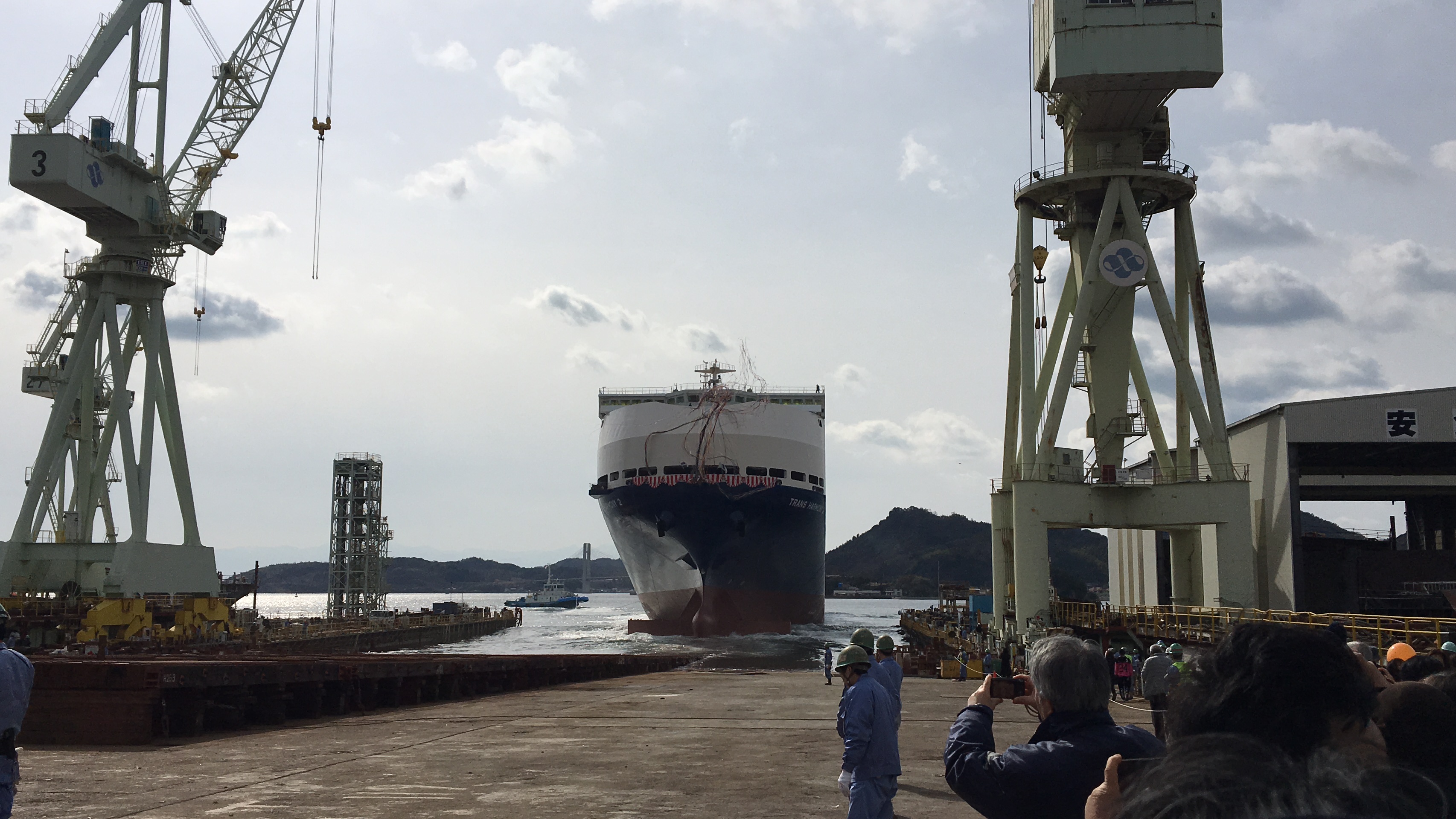 2018年2月2日 / 最終更新日 : 2018年2月7日 因島観光協会 PR 内海造船因島工場で進水式を挙行 2018年1月31日(水)内海造船因島工場にて、総トン数50,200トンの大型自動車運搬船の進水式が行われました。 寒波で非常に寒い中でしたが、大きな船の進水式をこの目に収めようとたくさんの方が来られていました。 緊迫した雰囲気の中、進水斧が振り下ろされると同時に大きなきしんだ音を立てながら船が海へ入っていく姿は、いつ見ても圧巻です。 無事進水したこの船も、これからは世界の海で活躍してくれることと思います。 進水式の様子