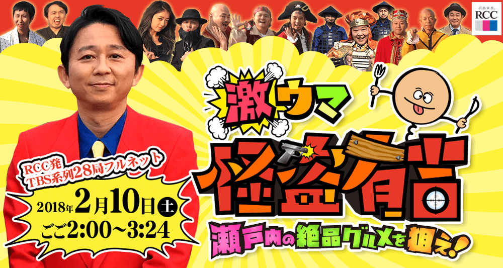2018年2月5日 / 最終更新日 : 2018年2月13日 因島観光協会 テレビ・ラジオ放送告知 【2/10】『激ウマ 怪盗有吉 瀬戸内の絶品グルメを狙え!』(RCC中国放送)に因島が登場!!(終了しました) 2018年2月10日(土)14:00~15:24に、TBS系列で全国放送される『激ウマ 怪盗有吉 瀬戸内の絶品グルメを狙え!』(RCC中国放送)に因島が登場します。 向島、因島、生口島を舞台に、怪盗有吉一味が絶品激ウマグルメを狙って各島にいる芸人と対決。 因島では、上島竜兵率いる上島水軍の本拠地として、水軍城と中庄公民館で撮影が行われました。 楽しい番組を通して因島の魅力を再発見できると思いますので、ぜひご覧ください。 水軍城での撮影の様子 中庄公民館での撮影の様子