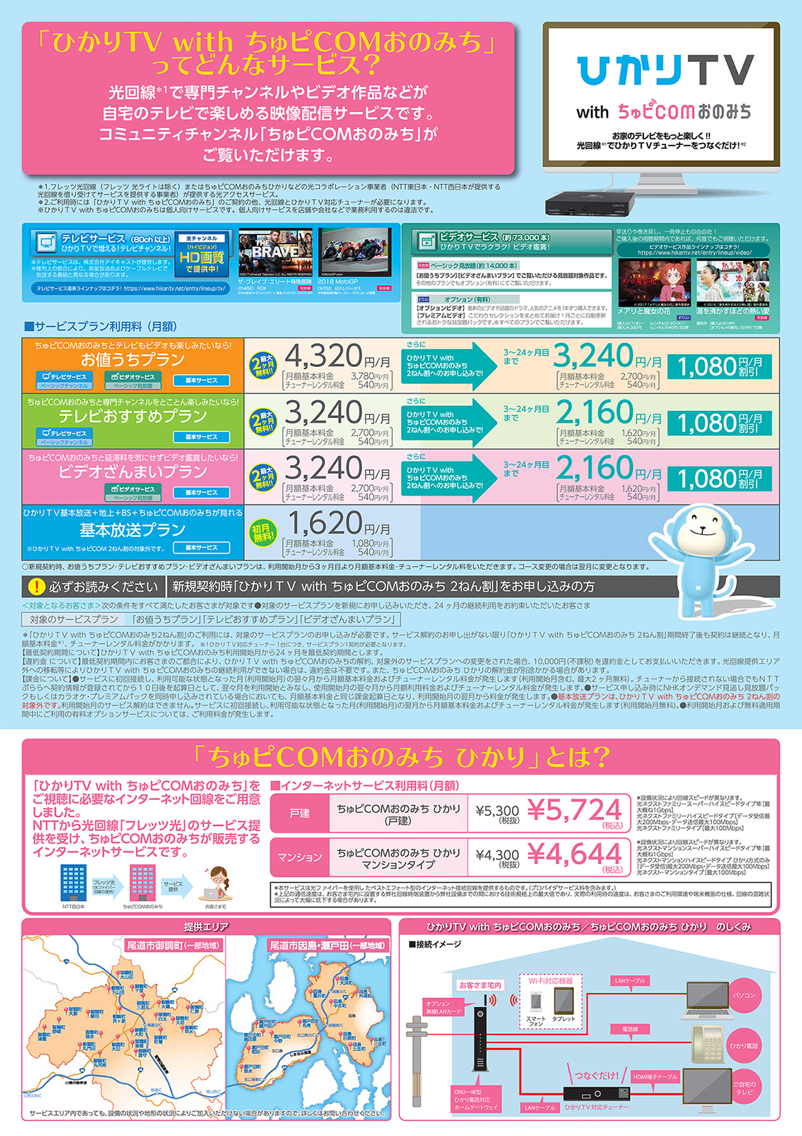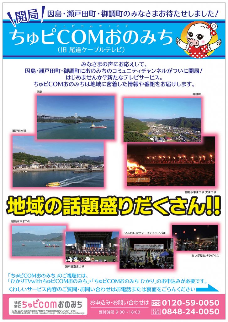 2018年3月27日 / 最終更新日 : 2018年4月3日 因島観光協会 PR 因島に“ちゅピCOMおのみち(旧尾道ケーブルテレビ)”が開局されます この度、“ちゅピCOMおのみち(旧尾道ケーブルテレビ)”が因島にも開局されることになりました。 より地域に密着した情報や番組が見られるようになります。 興味のある方は、“ちゅピCOMおのみち(旧尾道ケーブルテレビ)”にお問合せください。 お申込み・お問合せ ちゅピCOMおのみち(旧尾道ケーブルテレビ) TEL.0120-59-0050 または 0848-24-0050 受付時間 9:00~18:00