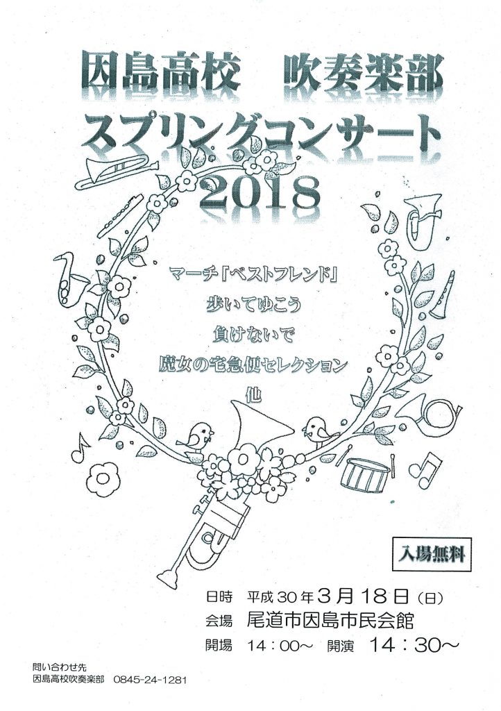 2018年3月7日 / 最終更新日 : 2018年3月23日 因島観光協会 案内 【3/18】因島高校吹奏楽部 スプリングコンサート2018(終了しました) 3月18日(日)14:30から因島市民会館にて、因島高校吹奏楽部のスプリングコンサートが開催されます。 部員が少ない中、1年間一生懸命練習してきた成果をここで発表します。 高校生の奏でる爽やかなメロディーを、ぜひお聞きください。 日時 2018年3月18日(日) 開場 14:00~ 開演 14:30~ 会場 尾道市因島市民会館 入場無料 お問合せ 因島高校吹奏楽部 TEL.0845-24-1281