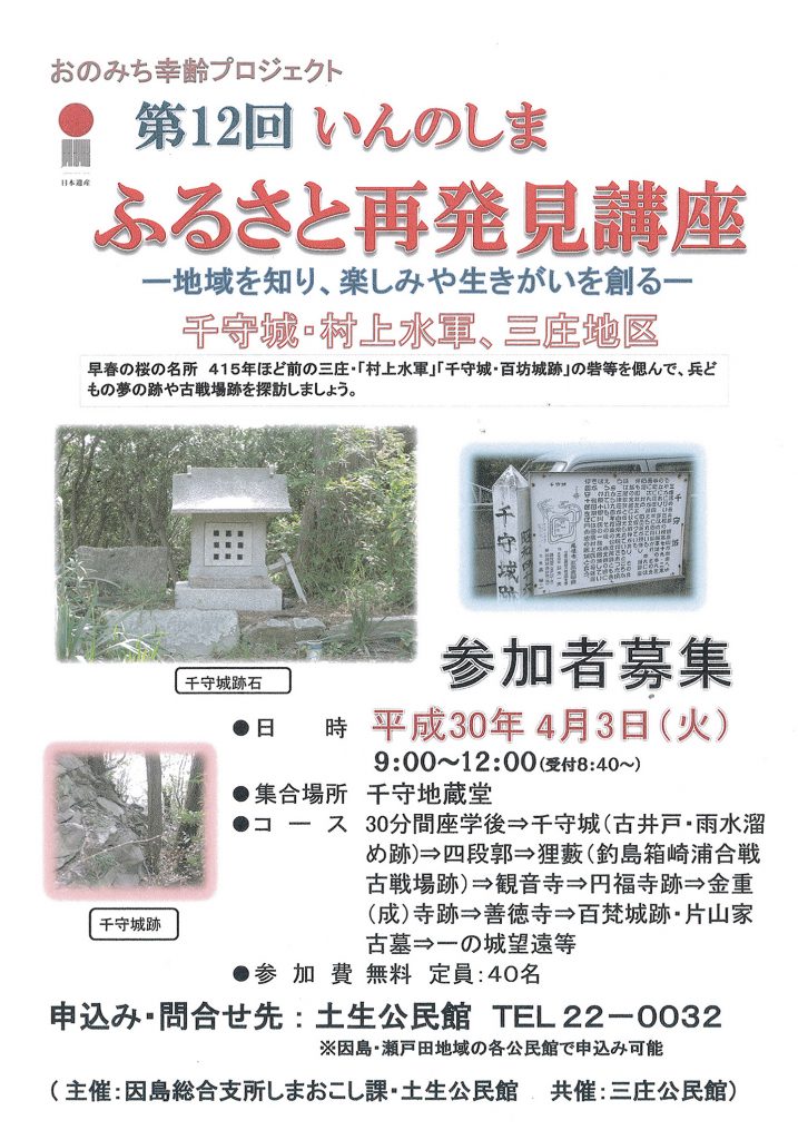 2018年3月26日 / 最終更新日 : 2018年4月3日 因島観光協会 案内 【4/3】おのみち幸齢プロジェクト 第12回ふるさと再発見講座-地域を知り、楽しみや生きがいを創る-千守城・村上水軍・三庄地区(終了しました) 4月3日(火)、おのみち幸齢プロジェクト 第12回ふるさと再発見講座が開催されます。 今回は、千守城・村上水軍、三庄地区を回り、村上海賊の歴史を学びます。 参加料は無料となっておりますので、ぜひご参加ください。 日時 2018年4月3日(火)9:00~12:00(受付8:40~) 集合場所 千守地蔵堂 参加費 無料 定員 40名 申込み・お問合せ 土生公民館 TEL.0845-22-0032 ※因島・瀬戸田地域の各公民館で申込可能 主催 因島総合支所しまおこし課・土生公民館 共催 三庄公民館