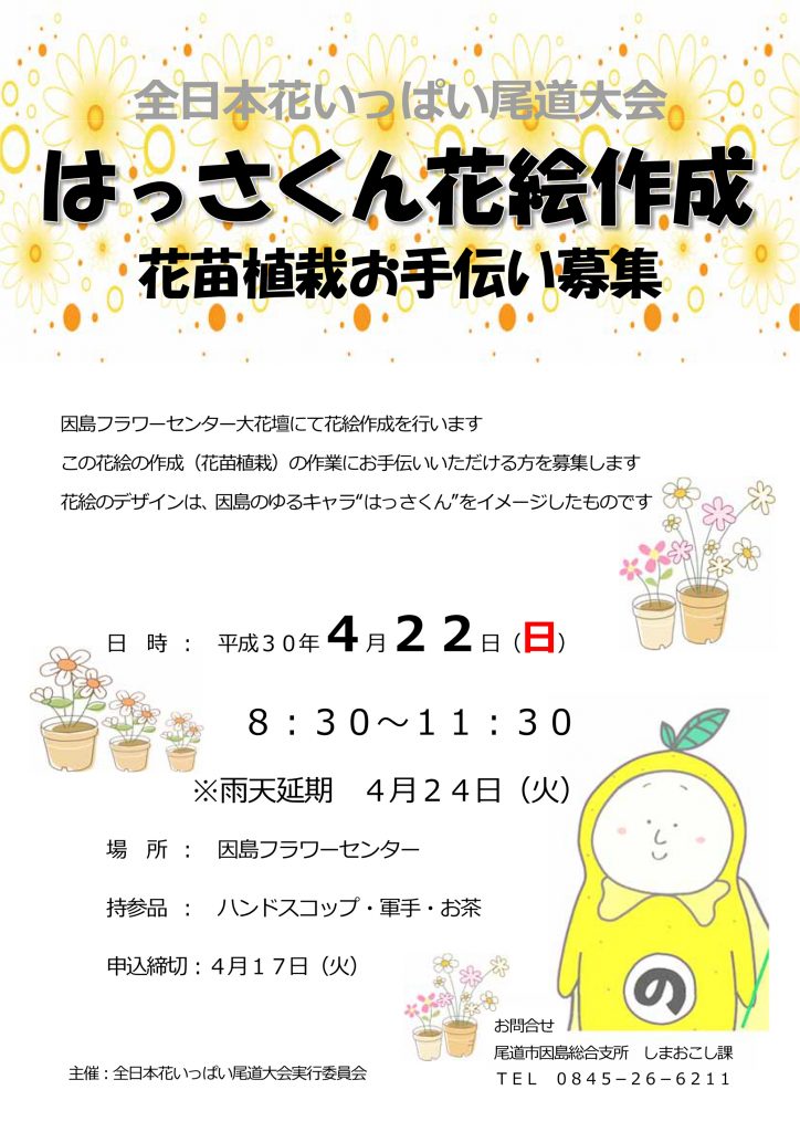 【4/22】全日本花いっぱい尾道大会 はっさくん花絵作成 花苗植栽お手伝い募集(終了しました)