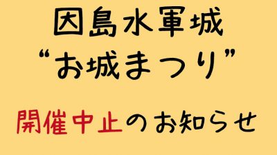 2020年9月13日 / 最終更新日 : 2020年9月25日 因島観光協会 イベント 因島水軍城“お城まつり”開催中止のお知らせ 11月8日(日)に開催を予定しておりました「因島水軍城“お城まつり”」は、新型コロナウイルス感染症を受け、開催中止を決定致しました。 開催に向けて検討を重ねて参りましたが、三密を回避する対応が困難なため、参加者の皆様や運 […]