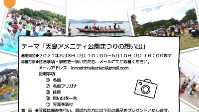 2021年5月2日 / 最終更新日 : 2021年5月2日 因島観光協会 イベント アメニティ公園まつり想いで写真公募 毎年5月3日-4日に開催している『因島アメニティ公園まつり』 新型コロナウイルス感染拡大のため、2020年・2021年はイベント中止とさせて頂きました。 イベント中止ですが、今までの因島アメニティ公園まつりの皆さんの想い […]
