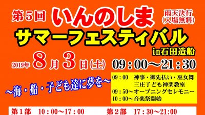 2019年7月11日 / 最終更新日 : 2019年7月12日 因島観光協会 案内 第5回いんのしまサマーフェスティバルin石田造船 今年も「いんのしまサマーフェスティバル」が開催されます! ステージイベント、マリンスポーツ体験、バザー、打上花火などがあります 日 時 2019年8月3日(土) 9:00~21:30 場 所 石田造船(尾道市因島三庄町2 […]