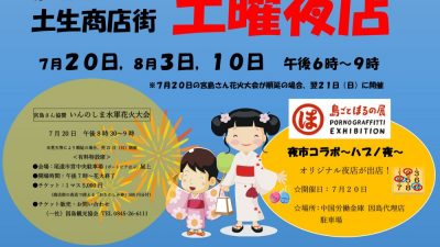 2024年7月4日 / 最終更新日 : 2024年7月9日 因島観光協会 案内 第45回土生商店街 土曜夜店 ◇土曜夜店◇ 7月20日、8月3日、10日 午後6時~9時 ※7/20の宮島さん花火大会が順延の場合、翌21日開催 ◇花火大会特設席(有料)◇ 7月20日(土) ※7/20の宮島さん花火大会が順延の場合、翌 […]