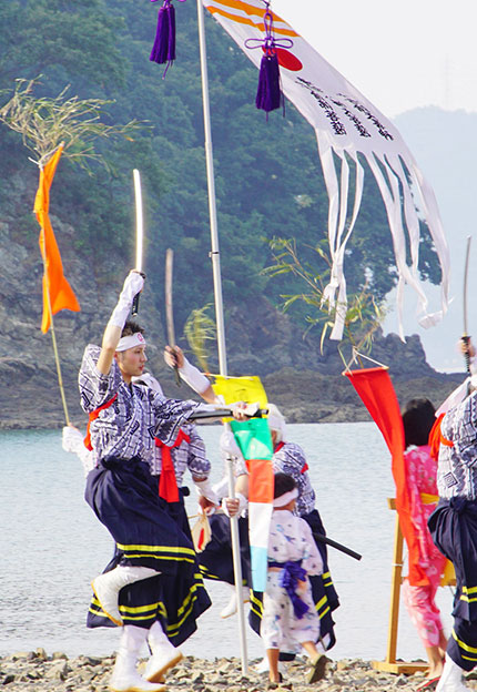 因島の伝統芸能として代表されるものとして、広島県無形民俗文化財に指定されている、「椋浦の法楽おどり」があります。手には太刀と扇子を携え、薄化粧した男性達が、「なむあみでーば(南無阿弥陀仏)」と唱えながら、「とんだ、とんだ」の掛け声に合わせて飛び踊ります。村上海賊の出陣式がこの祭りのルーツであると伝えられ、五穀豊穣・無病息災などを祈る行事として、現在もなお椋浦町の方々によって継承されています。