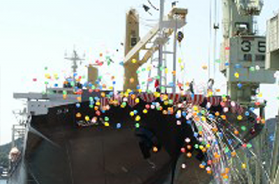 因島では船の進水を、全国的にも珍しい「ボール進水方式」で行っています。進水斧が振り下ろされ、船を支えていた綱が切られると、船がゆっくりと海へ滑り出し、水しぶきを上げて巨体を浮かばせます。大きな船が海へ滑り込む迫力と、それを見守る造船マンの姿が感動的です。