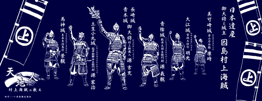 新村上海賊タペストリー 価格 850円(税込) サイズ 約 縦350mm×横900mm 勝鬨を挙げている様子が手ぬぐいになっています。 ※画像はイラストです。 ※画像の色は実物と異なって見える場合がございます。予めご了承ください。 【取り扱い場所】 ・因島水軍城 ・因島観光協会