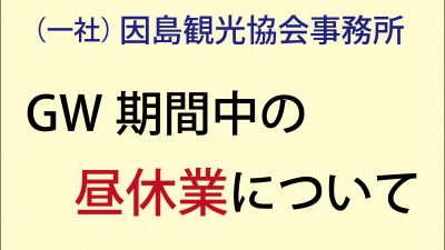 2024年4月23日 / 最終更新日 : 2024年4月23日 因島観光協会 案内 (一社)因島観光協会事務所 GW期間中の昼休業について 下記☆マークの日にちの窓口営業時間は9時~12時、13時~16時とさせていただき、昼休業(12時~13時)を取らせていただきます。 ご迷惑ご不便をおかけしますがよろしくお願いいたします。 窓口営業時間 ○: […]