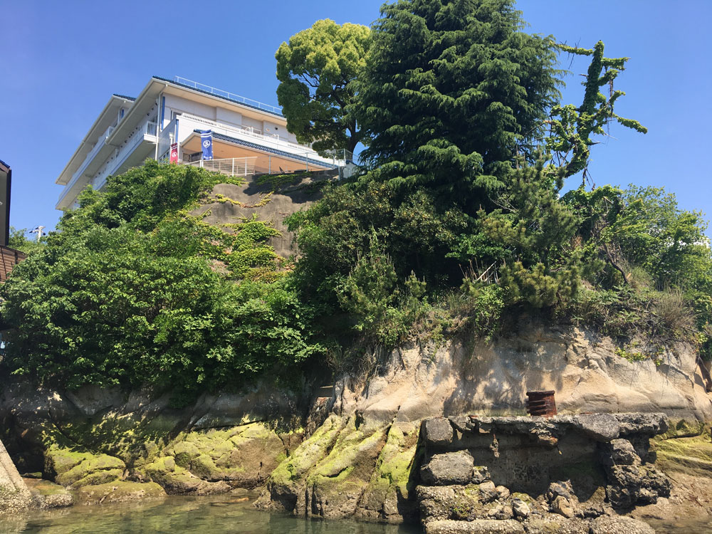 周辺は、埋め立てられていますが、半島のように突き出ていたと考えられ、船隠しがあったと推測されます。村上氏が向島の余崎城に移るまでの約180年間本拠地であったと伝えられています。テラスでティータイムを過ごすのも贅沢な時間です。