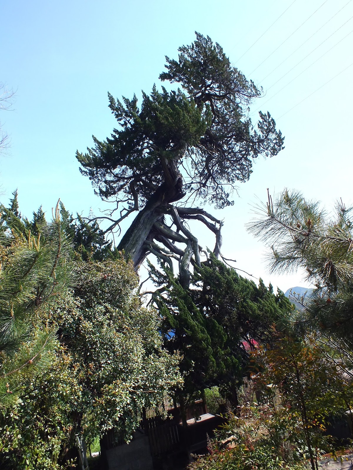 釣島箱崎浦合戦で島前城主今岡通任の長子藤原通宗が戦死した場所に岡野明神藤原神社が建てられ、岡野姓、藤原姓の先祖神として祀られています。写真は、その後植えられたと伝わるビャクシンの大木です。