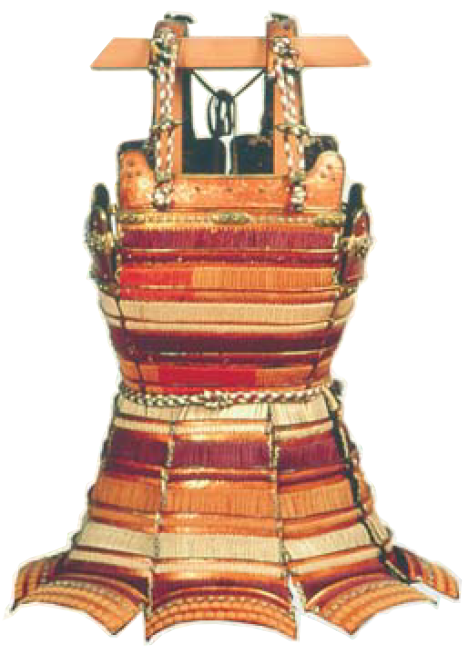 吉充の子息である吉亮が元服した際に、 小早川隆景ょり贈られた甲冑です。 大名や武将が身に着ける絢爛豪華な甲冑とは異なり、 兜や袖を付けない腹巻形式のものですが、 白、紫、緋色め糸の鮮やかさと相まって軽快な印象を見るものに与えてくれます。