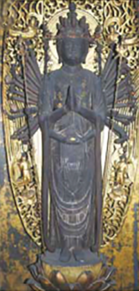 平安時代後期に造られたこの像は、向島余崎城の城主であった島居資長が光明寺に寄進したと伝えられています。 戦国時代に入ると仏像彫刻は武将や軍団の守護を祈願する護身仏としての意味合いを持つ作例が見られるようになり、 この像も船中に置かれた際に風雨を凌いだ伝説から別名「浪分観音」とも呼ばれ、 今日まで多くの人々から信仰を集めています。